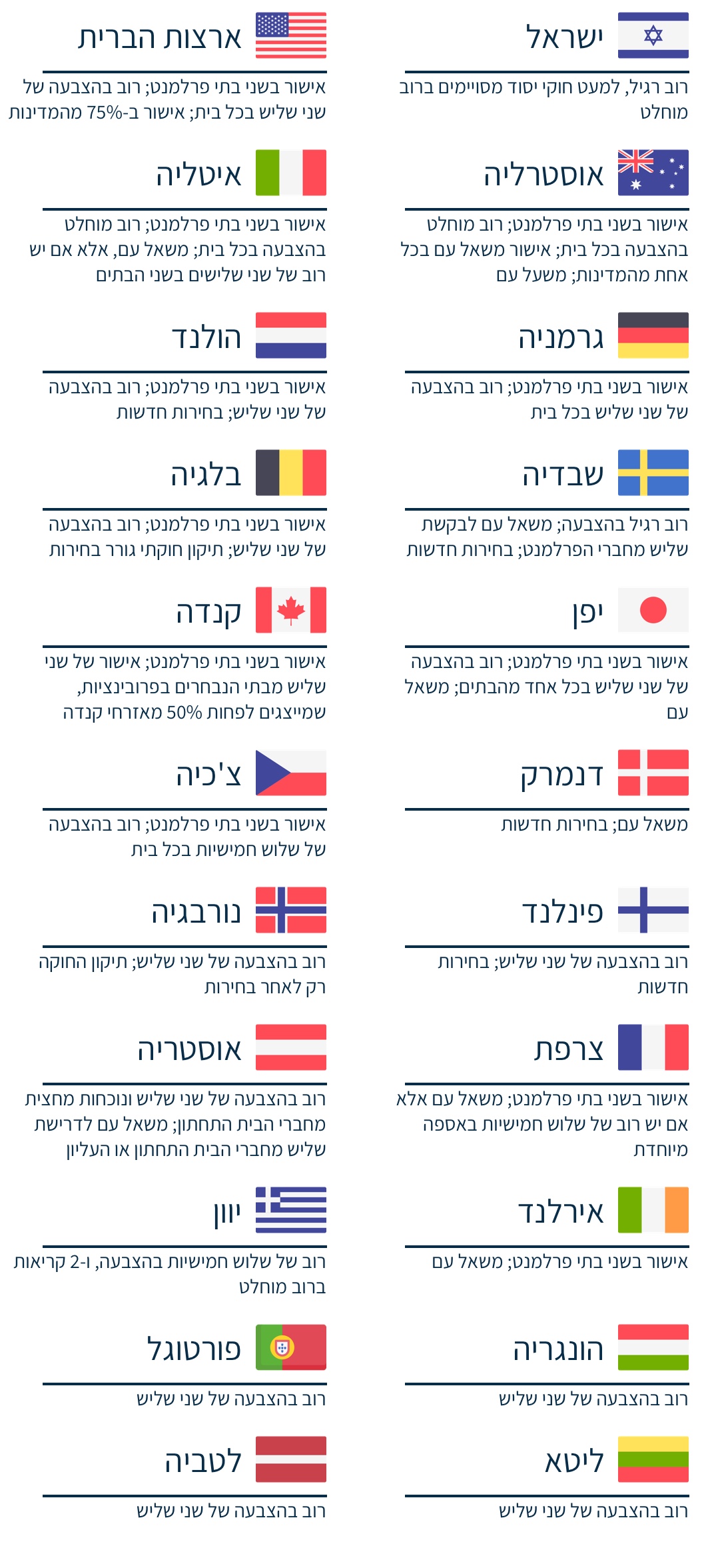 מצדדי פסקת ההתגברות מזכירים לפעמים שלוש מדינות דמוקרטיות אחרות שגם בהן יש הסדרים חוקתיים שונים המאפשרים חקיקה מנוגדת לזכויות יסוד: קנדה, בריטניה וניו זילנד, אך צריך לזכור שבשלוש המדינות הללו יש מגילת זכויות מפורטת בהרבה מזו הקיימת בישראל, כי בקנדה מעולם לא נעשה שימוש בפסקת ההתגברות על ידי הפרלמנט הפדרלי, וכי בבריטניה וניו זילנד קיימת ציפייה כי יבוצעו תיקוני חקיקה בעקבות פסיקות הצהרתיות של בית המשפט על אי-חוקתיות חקיקה קיימת.