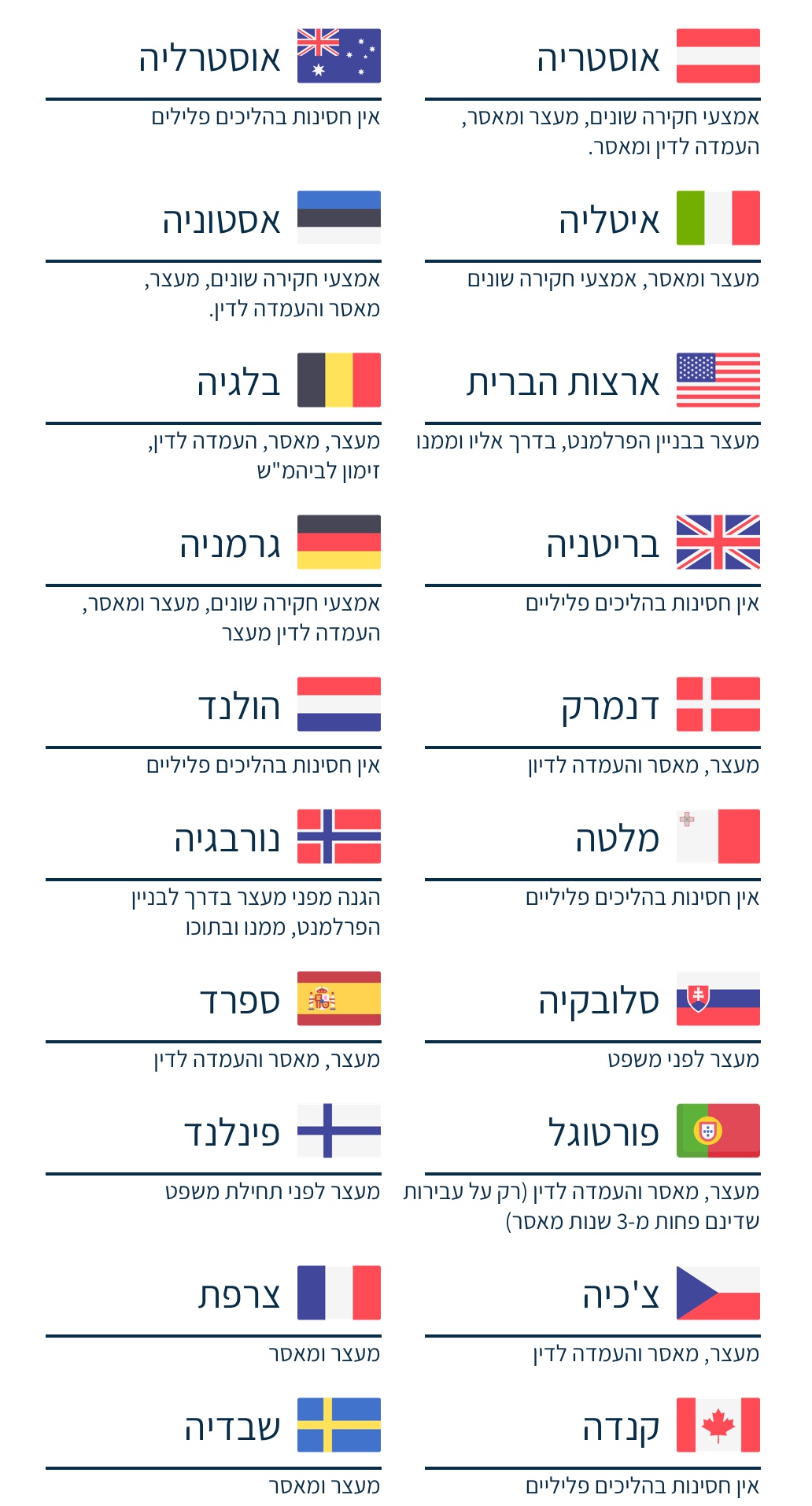 - רק ב-6 מתוך 20 המדינות שנבדקו (צ'כיה, דנמרק, ספרד, גרמניה, אוסטריה, אסטוניה) קיימת "חסינות אוטומטית" לחברי פרלמנט. ב-3 מדינות מתוכן (אוסטריה, אסטוניה ודנמרק), החסינות חלה רק אם העבירות קשורות לתפקידיו הפוליטיים.