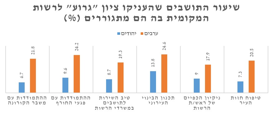 מבחינת הרשויות, המשבר החריף אליו נקלעו בא לידי ביטוי בין היתר גם בחוסר שביעות רצון התושבים מתפקודן. מדד הקול הישראלי של המכון הישראלי לדמוקרטיה מחודש דצמבר האחרון מצביע על שביעות רצון נמוכה ביותר של התושבים ברשויות הערביות ביחס לזו של תושבים יהודים ברשויות מקומיות יהודיות בשורה של תחומים, ובתוך כך גם בהתמודדות עם משבר הקורונה. בהתאם, 54% מהציבור הערבי השיבו שהם תומכים בהעברת יותר סמכויות ממשרדי הממשלה לרשויות המקומיות, בהשוואה ל-74.5% בקרב הציבור היהודי.
