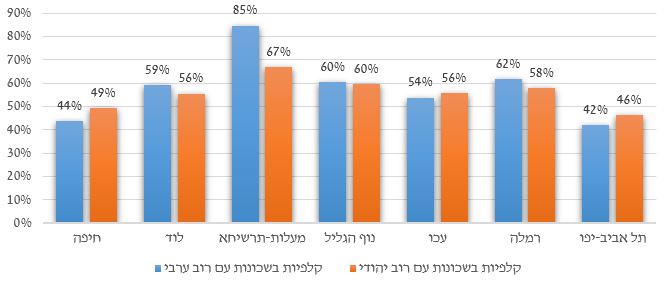 *מקור: עדו אבגר, אתי וייסבלאי, רמי שוורץ ומיכל לרר ערבים בערים המעורבות: מבט-על (הכנסת, מרכז המחקר והמידע, 2021); עיבוד המכון הישראלי לדמוקרטיה לנתוני הלמ"ס לעניין שיעור התושבים הערבים בעיר.