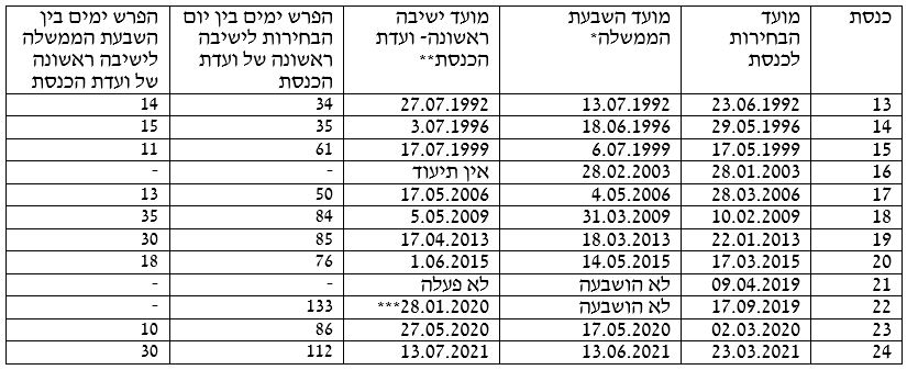 בהשוואה לכנסות שכיהנו במהלך שלושת העשורים האחרונים, משך הזמן שעבר בין מועד הבחירות למועד השבעת הממשלה הנוכחית, גבוה למדי. גם בהשוואת מספר הימים בין מועד הבחירות לתחילת עבודת ועדת הכנסת, הכנסת הנוכחית חריגה ביחס לקודמותיה