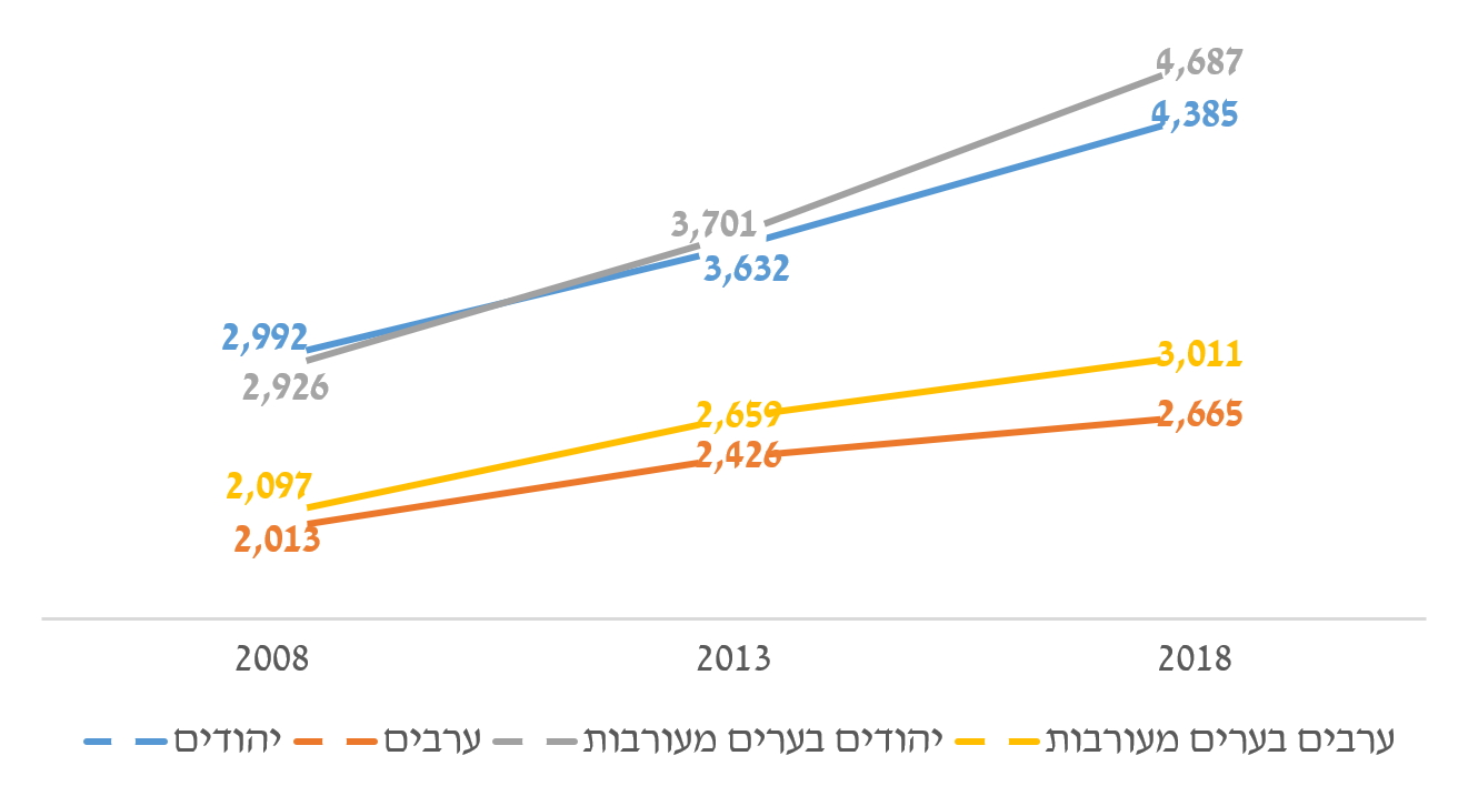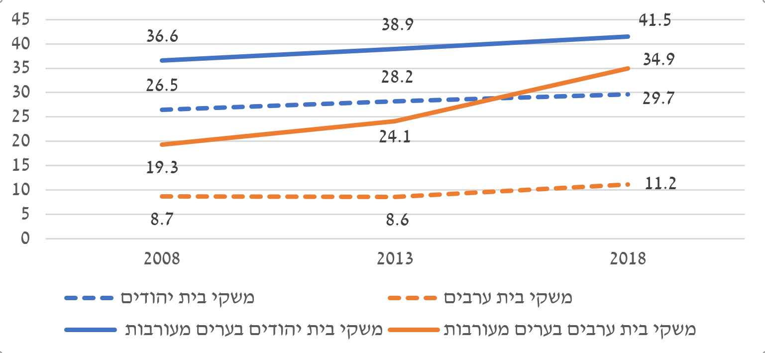 במקביל, לא מפתיע לראות את הנסיקה בשיעור משקי הבית הערבים בערים מעורבות השוכרים דירה (תרשים 10). בשנים 2018-2008 עלה שיעורם ב-15.6 נקודות האחוז (מ-19.3% ל-34.9%), עלייה דרמטית ביחס לשאר האוכלוסייה. בשנים אלו חלה הפכה ההוצאה החודשית למשקי הבית הערבים על דיור למשמעותית במיוחד. בקרב משקי בית ערבים מערים מעורבות חלה עלייה של 44% בשנים 2018-2008, נמוך מבקרב יהודים מערים מעורבות (עלייה של 60%) אך גבוה משמעותית מהעלייה הכלל ארצית בקרב ערבים (32%) (תרשים 8). הסבר אפשרי לכך הינו העלייה בשיעור משקי הבית הערבים בערים אלו הגרים בדירה שכורה, וכן מחירי הדיור והשכירות שהאמירו בדיוק בשנים אלו.