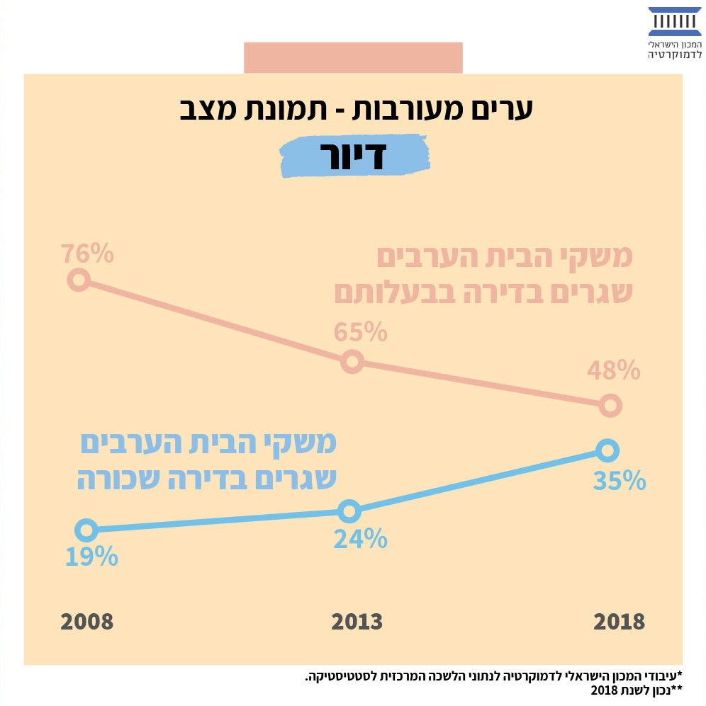 שיעור בעלי הדירות הערבים בערים המעורבות צלל בעשור האחרון, כאשר מדובר בירידה של כמעט פי עשרה מזאת שנרשמה בציבור היהודי, ופי כחמישה מהציבור הערבי הכללי. במקביל חלה נסיקה בשיעור שוכרי הדירה מקרב אותם תושבים