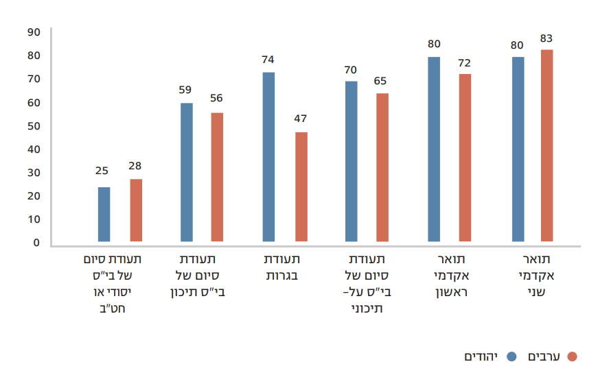שיעור מקבלי תואר ראשון בחברה הערבית עלה מ-10.3% בשנת 2007 ל-13.6% מתוך כלל הסטודנטים בשנת 2019. בתואר השני העלייה גבוהה הרבה יותר: מ-4.9% בשנת 2007 ל-12.4% בשנת 2019. בתואר השלישי יש עלייה מ-2.8% בשנת 2007 ל-6% בשנת 2019.