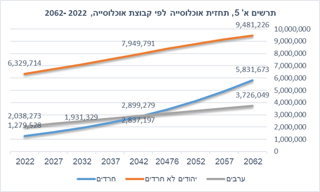האוכלוסייה החרדית בישראל מונה כ-1,280,000 נפש, והיא בעלת קצב הגידול המהיר בקרב המדינות המפותחות, בשיעור של כ-4% בשנה. היא מהווה 13.3% מהאוכלוסייה הישראלית, מתוכם 60% צעירים מתחת לגיל 20 (לעומת 31% באוכלוסייה הכללית). לפי תחזיות הלשכה המרכזית לסטטיסטיקה, האוכלוסייה החרדית תהווה 16% מכלל החברה הישראלית עד שנת 2030.