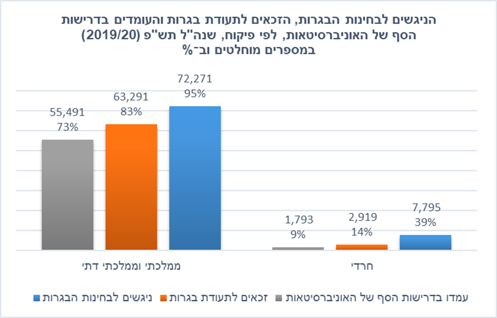 מספר הסטודנטים החרדים בשנת תשפ"ב (2021/22) עמד על כ-15,600, 4.5% מכלל הסטודנטים. החרדים בוחרים ללמוד בעיקר במכללות, שתנאי הסף לקבלה בהן נמוכים יחסית, ורק 8.5% מהם לומדים באוניברסיטאות (לא כולל האוניברסיטה הפתוחה), לעומת 33.5% בקרב יהודים לא-חרדים.