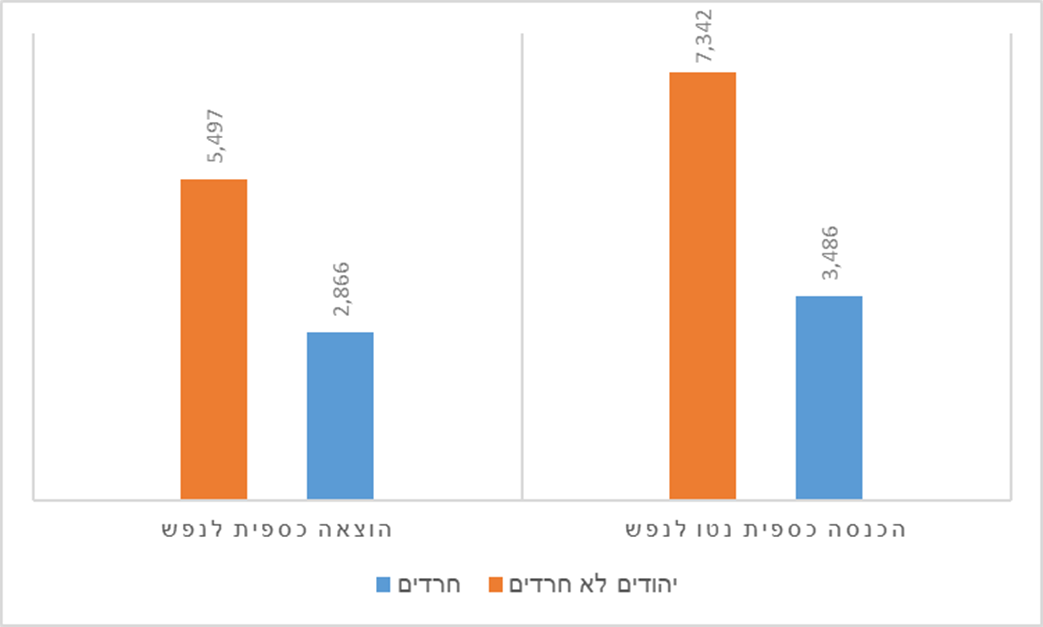 כאשר בודקים את ההוצאה החודשית של משקי הבית, מתברר כי משק בית חרדי הוציא ב-2019 13,824 ש"ח בחודש, 21% פחות ממשק בית יהודי לא חרדי – פער המוסבר במאפייני תרבות הצריכה החרדית, הדוגלת בחיסכון, וכן במרחבי צריכה קהילתיים ייעודיים לאוכלוסייה החרדית, המאפשרים לקנות מוצרים בזול ולפעמים אפילו לקבלם חינם.