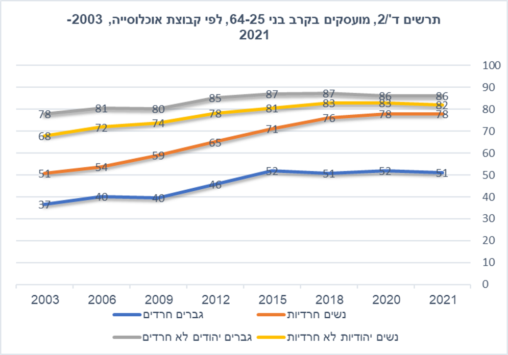 לפי נתוני 2021, 51% מהגברים החרדים ו-78% מהנשים החרדיות עובדים. נתונים לא מלאים (שלושה רבעים ראשונים) של שנת 2022 מראים על שיעור תעסוקה של 53.5% לגברים חרדים, הגבוה ביותר ב-25 השנים האחרונות. גם בקרב הנשים נתוני שלושת הרבעונים הראשונים של 2022 מצביעים על שיעור תעסוקה הגבוה אי פעם – 80%. בה במידה, שיעור אברכי הכולל עלה בשנת 2021 בשיעור מתון של 2.4% בלבד. גובה ההכנסה הממוצעת של עובדים חרדים הוא 61% מגובה ההכנסה הממוצעת של עובדים יהודים לא-חרדים. גם בתחום זה ניכר פער בין גברים חרדים שהכנסתם הינה 53% בלבד מגברים יהודים לא חרדים, לעומת נשים חרדיות שהכנסתן עומדת על 73% מזו של יהודיות לא חרדיות.