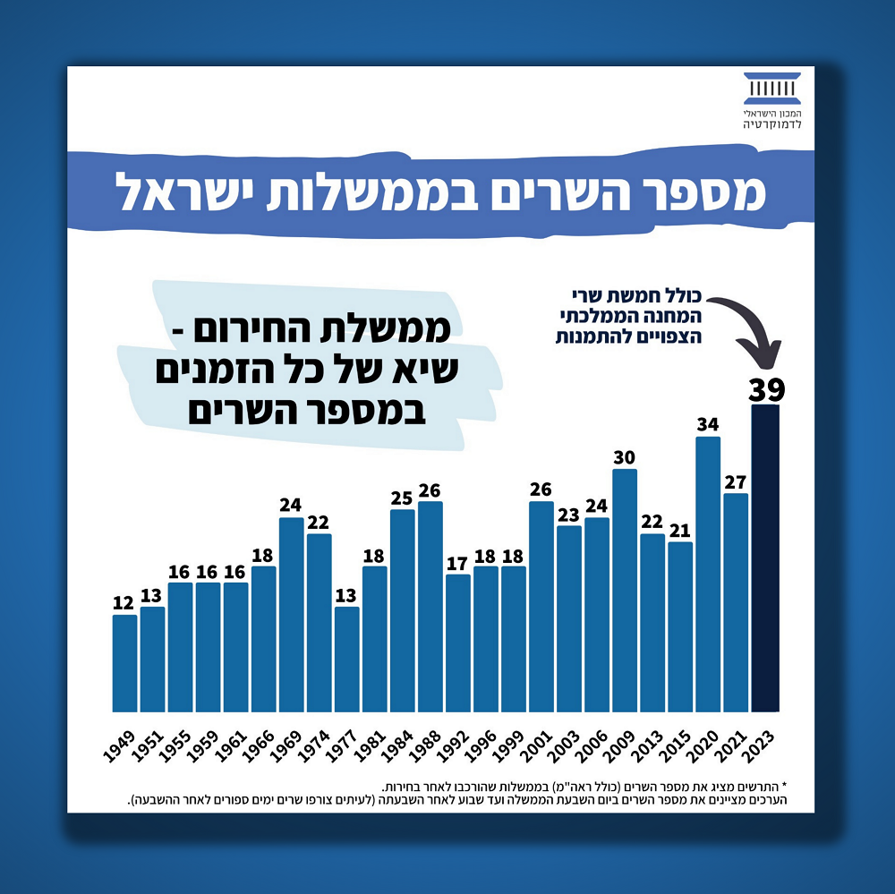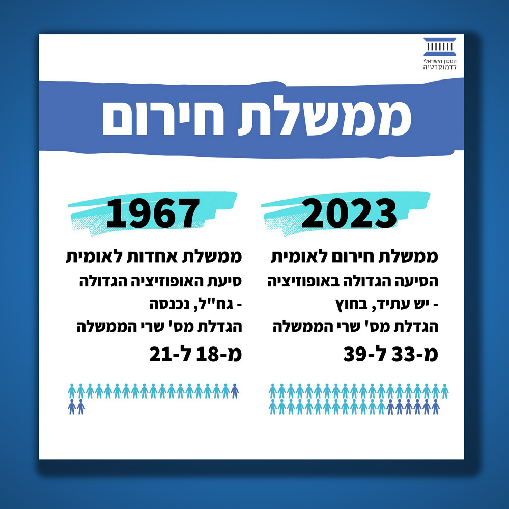 שנית, ב-1967 מנתה הממשלה 18 שרים, והיא גדלה ל-21 עם הרחבתה לממשלה חירום. לעומת זאת, הממשלה הנוכחית מונה ערב הרחבתה 34 שרים (השנייה בגודלה בהיסטוריה) ומחר היא תתפח לממדים חסרי תקדים של 39 שרים! בכך היא תשבור שיא של כל הזמנים.