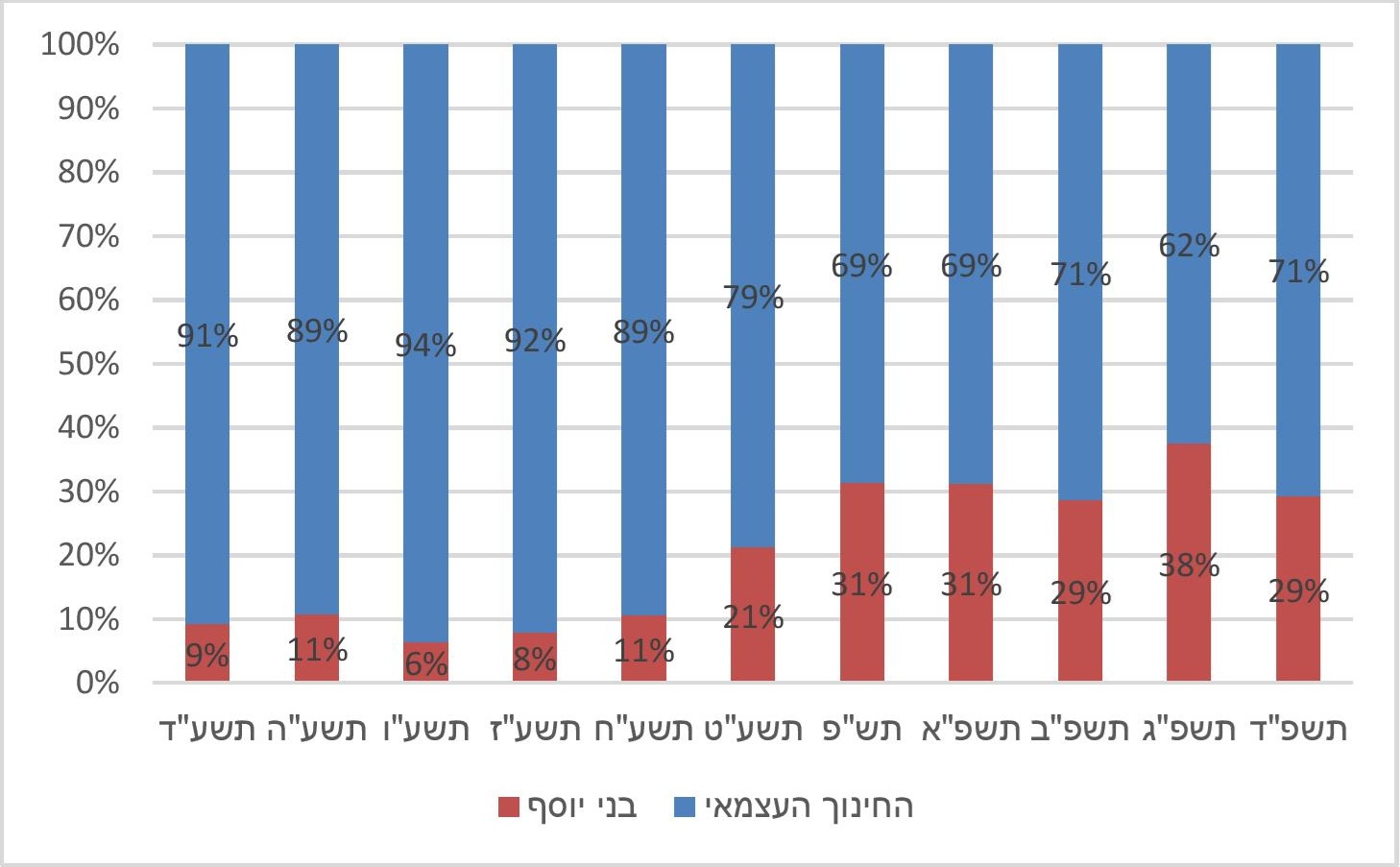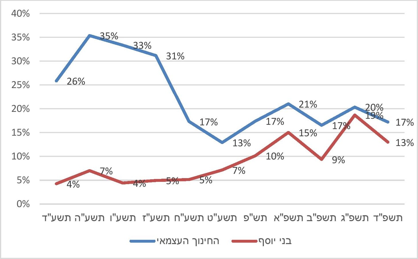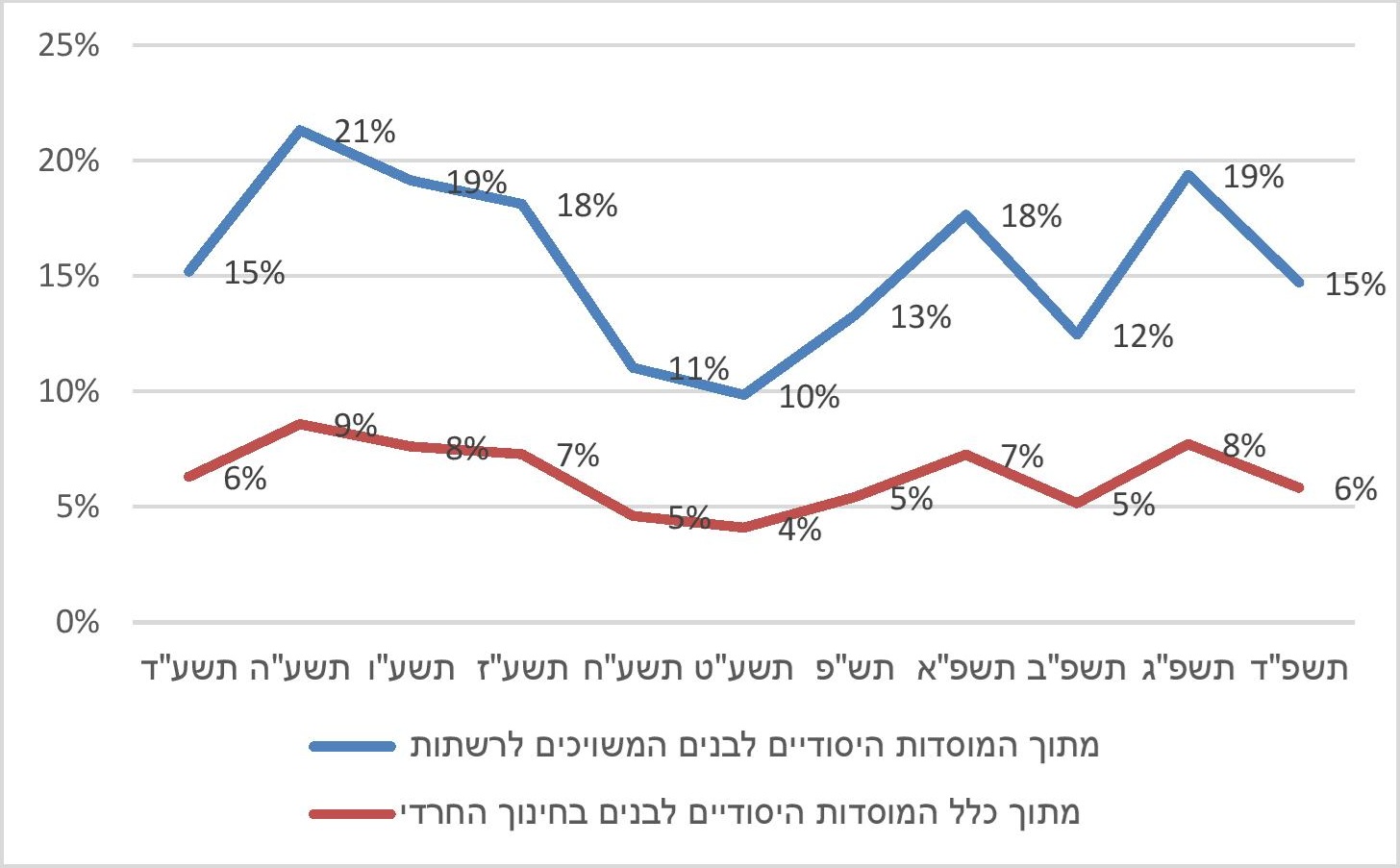 תרשים 2. שיעור מוסדות החינוך היסודיים לבנים בחינוך החרדי שקוזז מתקציבם בגין אי-לימוד מקצועות ליבה כנדרש, תשע"ד-תשפ"ד (ב-%)