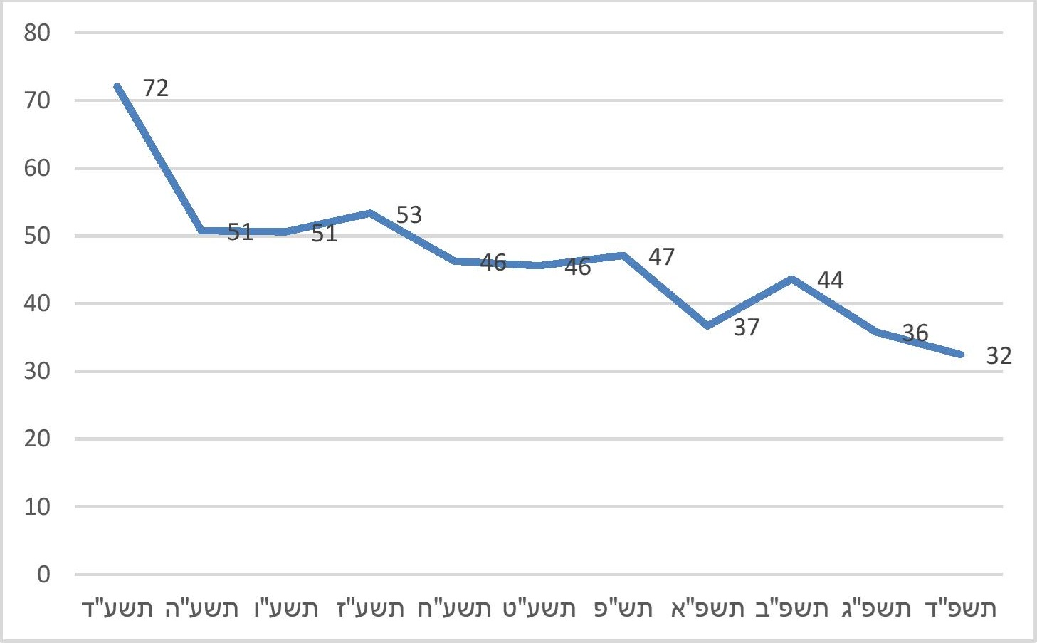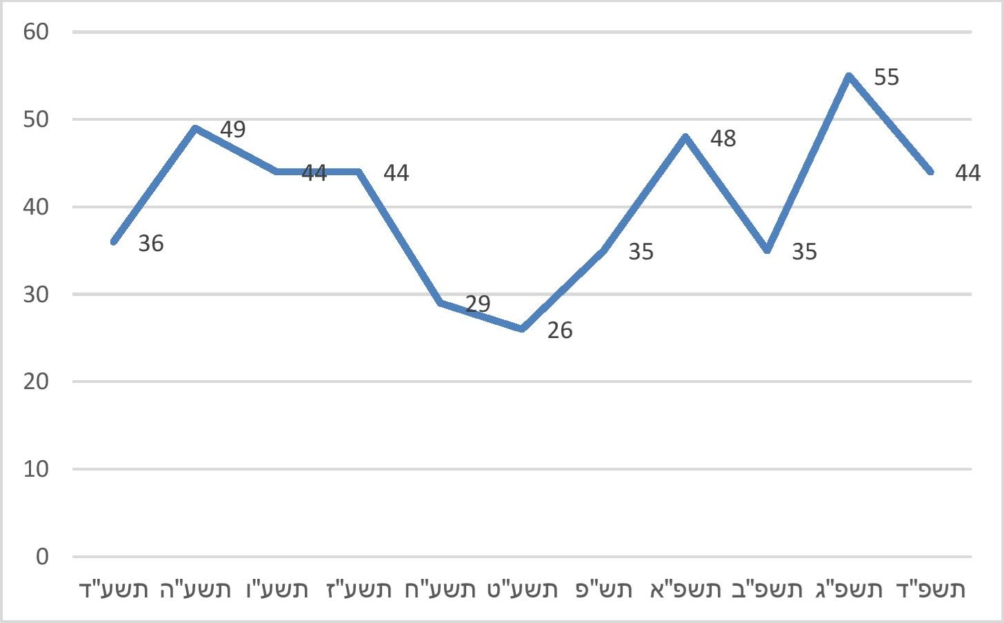 תרשים 3. מספר מוסדות החינוך היסודיים בחינוך החרדי שקוזז מתקציבם בגין אי-לימוד מקצועות ליבה כנדרש, תשע"ד-תשפ"ד