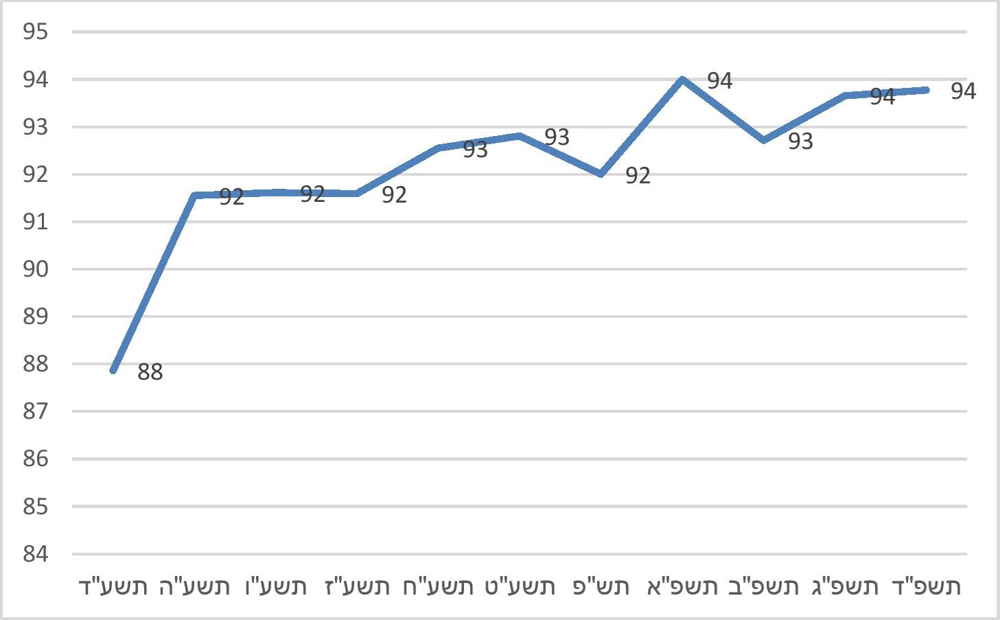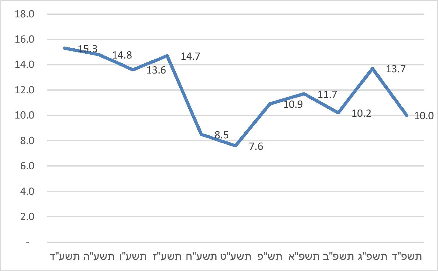 תרשים 4. שיעור ההשתתפות התקציבית הממוצע של משרד החינוך בתקציב מוסדות החינוך היסודיים בחינוך החרדי שקוזז מתקציבם בגין אי-לימוד מקצועות ליבה כנדרש, תשע"ד-תשפ"ד (ב-%)