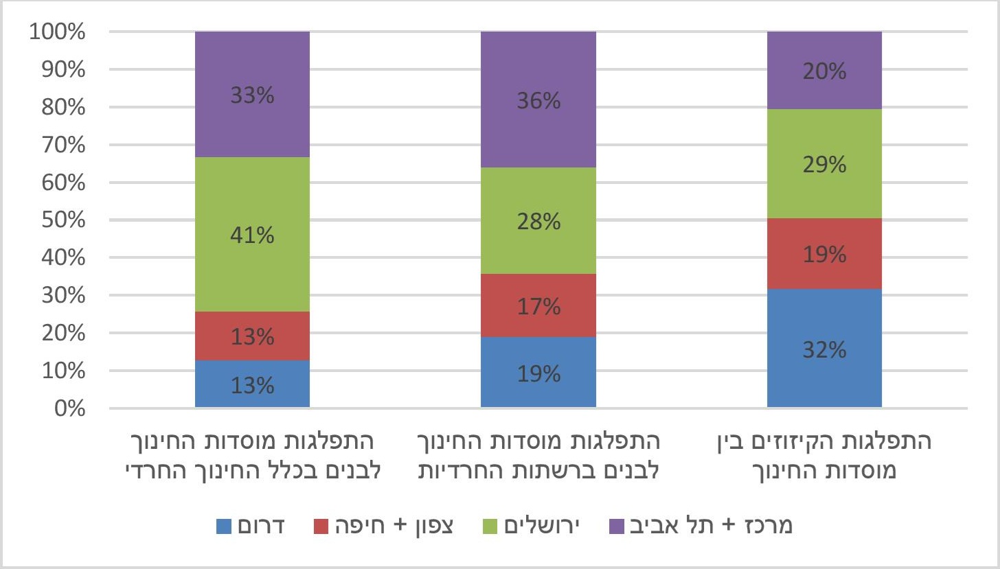 מהתרשים עולה כי באופן יחסי להתפלגות מוסדות החינוך החרדיים, משרד החינוך עורך שיעור גבוה יותר של קיזוזי תקציב בבתי הספר הנמצאים בפריפריה, ובפרט במחוז הדרום. במחוז זה נערכו לאורך השנים 32% מהקיזוזים התקציביים, אף שפועלים בו רק 19% מהמוסדות לבנים ברשתות ו-13% מהמוסדות לבנים בחינוך היסודי החרדי. מנגד, במחוזות שבהם נמצאים הריכוזים החרדיים הגדולים והשמרנים יותר, מחוז ירושלים (הערים ירושלים, בית שמש, מודיעין עילית וביתר עילית) ומחוזות מרכז ותל אביב (הערים בני ברק ואלעד), בולט כי שיעור הקיזוזים נמוך יותר אף ששיעור המוסדות הפועלים בהם גבוה יותר.