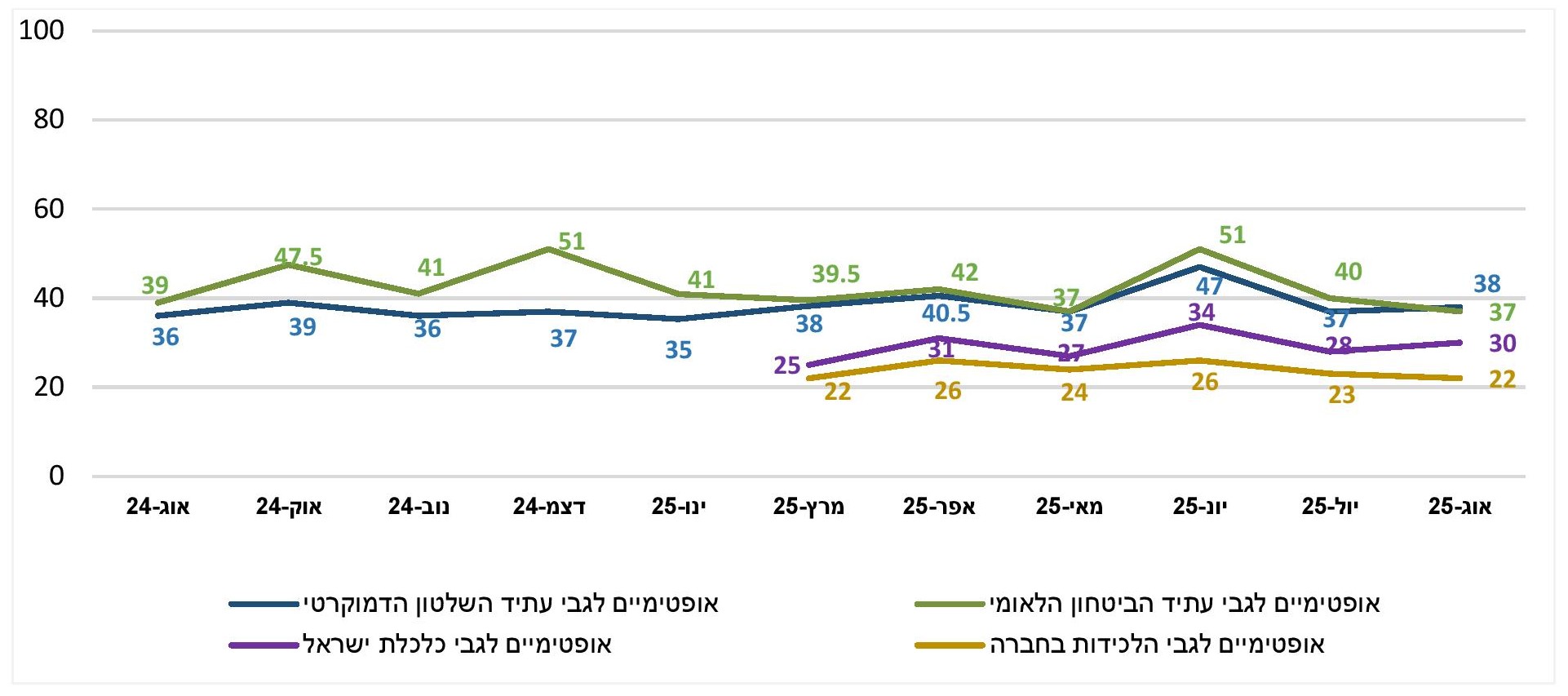 אופטימיים לגבי עתיד השלטון הדמוקרטי בישראל, הביטחון הלאומי, הכלכלה והלכידות החברתית (%, כלל המדגם)