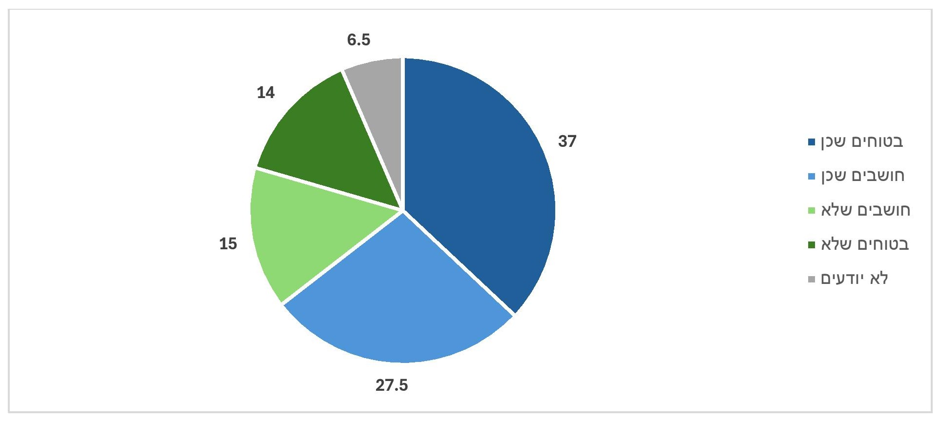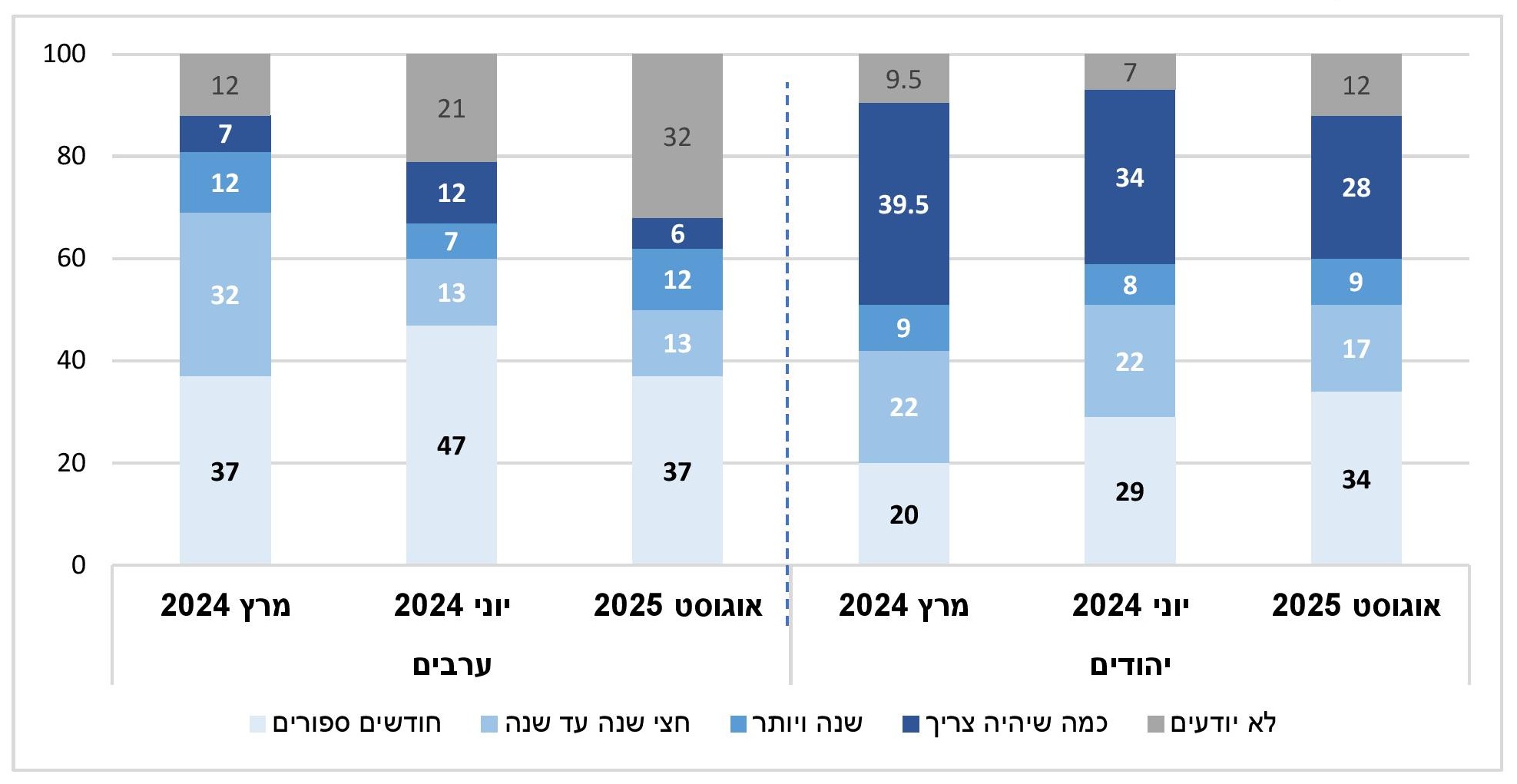 - כשליש מכלל הציבור סבורים שהחברה הישראלית תוכל לשאת בנטל הלחימה הממושכת עוד כמה חודשים בלבד. רק כרבע מאמינים שהיא תוכל לשאת בנטל כמה שיהיה צורך, ירידה חדה מהמדידות הקודמות.
