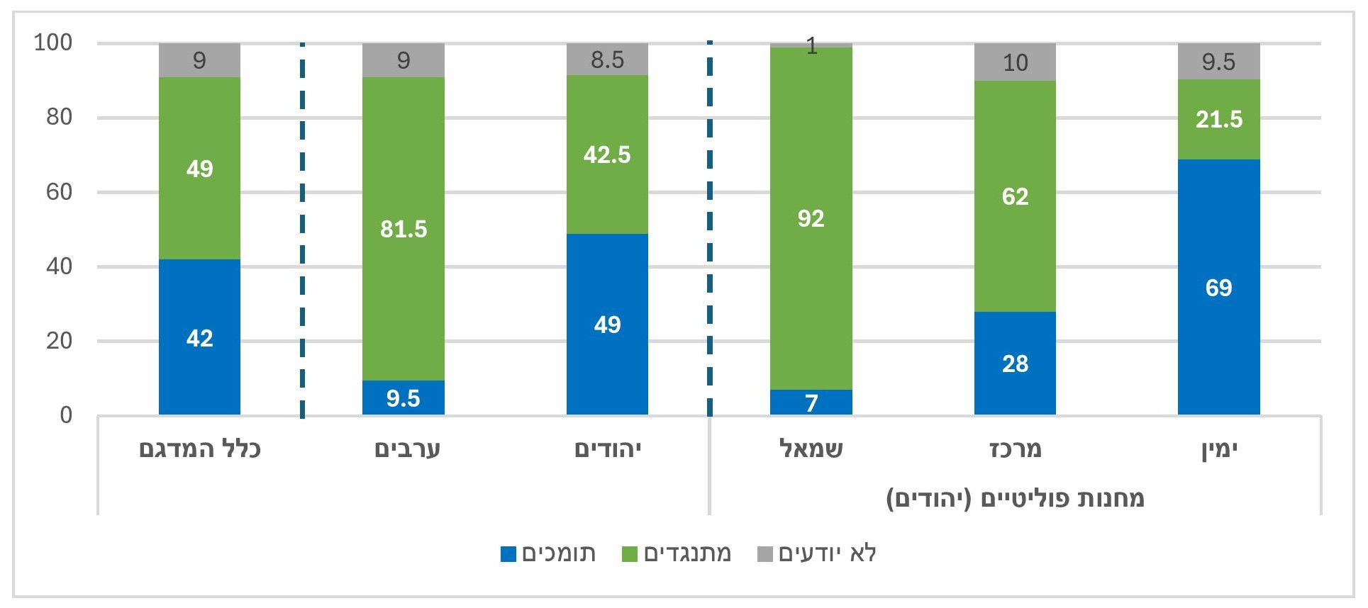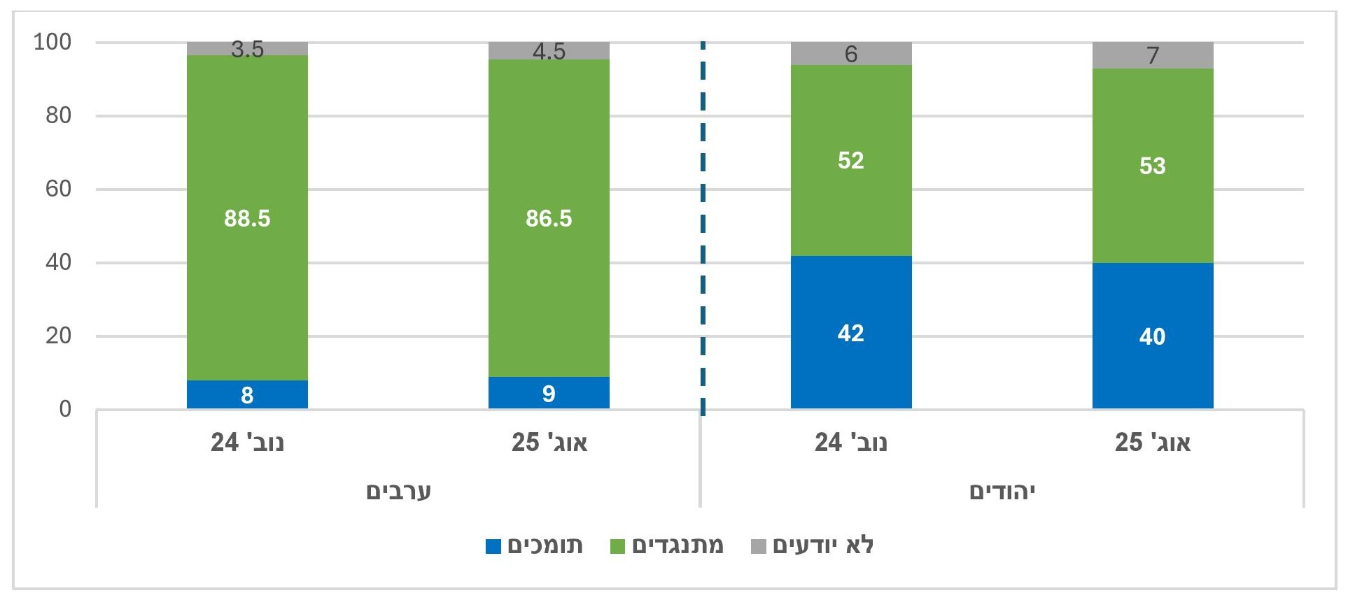 שאלנו: "האם את/ה תומך/ת או מתנגד/ת להתיישבות יהודית ברצועת עזה?". למעלה ממחצית מהיהודים וכמעט 90% בקרב הערבים מתנגדים להתיישבות כזו, שיעורים דומים מאוד לאלו שנמדדו בנובמבר 2024.