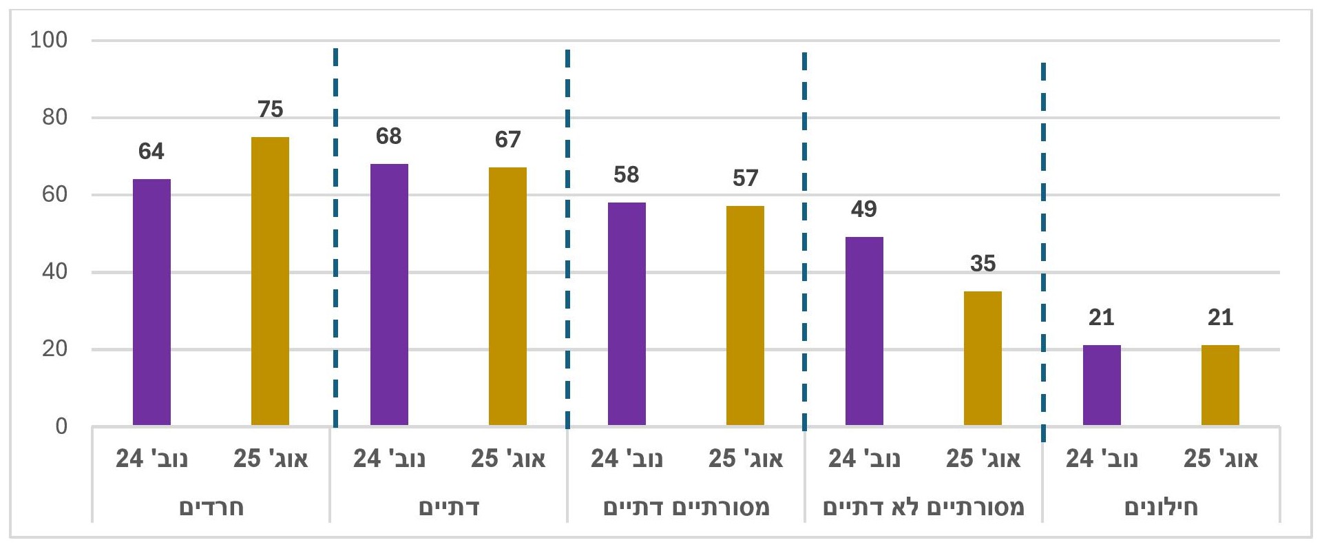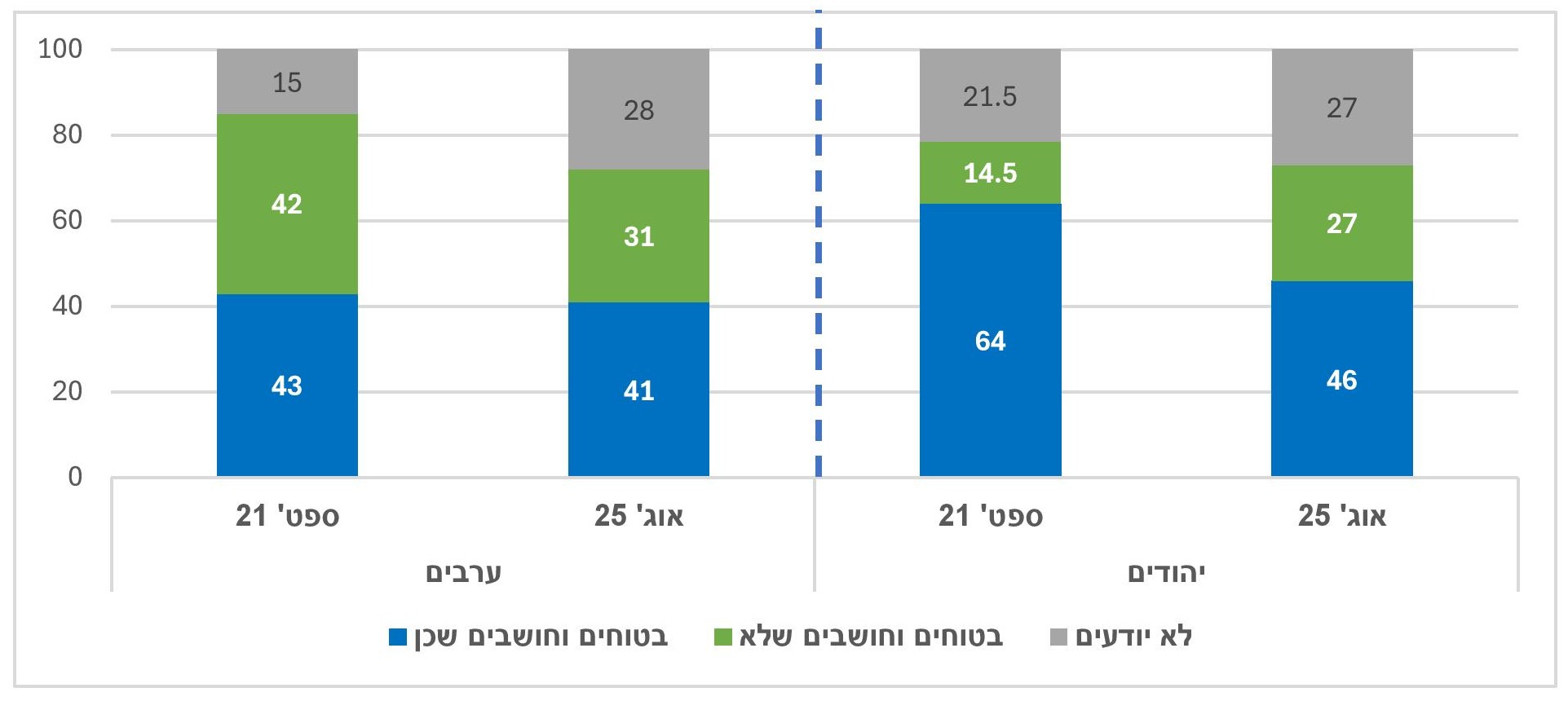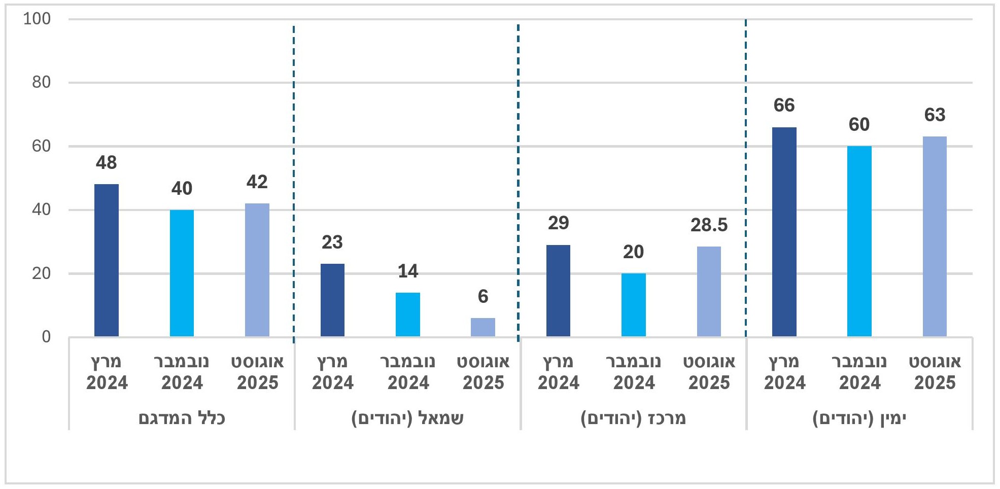 בשלושת המחנות הפוליטיים (יהודים) נרשמה ירידה בשיעור המאמינים שהחברה הישראלית תוכל לשאת בנטל המלחמה כמה זמן שיהיה צורך בכך (שמאל מ-23.5% במרץ 2024 ל-6% היום, מרכז מ-27% ל-16.5%, ימין מ-47% ל-39%).