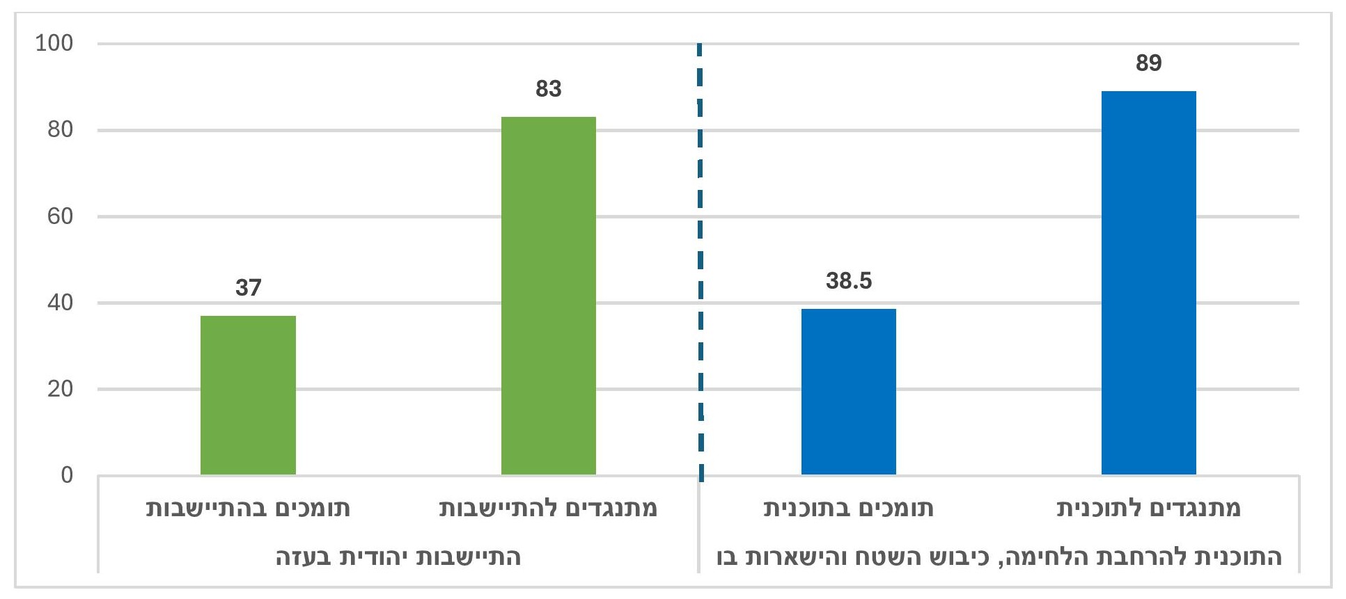 - רוב בכלל הציבור (הן בקרב היהודים הן בקרב הערבים) מתנגדים להתיישבות יהודית בעזה. ואולם, בימין (יהודים) כשני שלישים תומכים בכך.