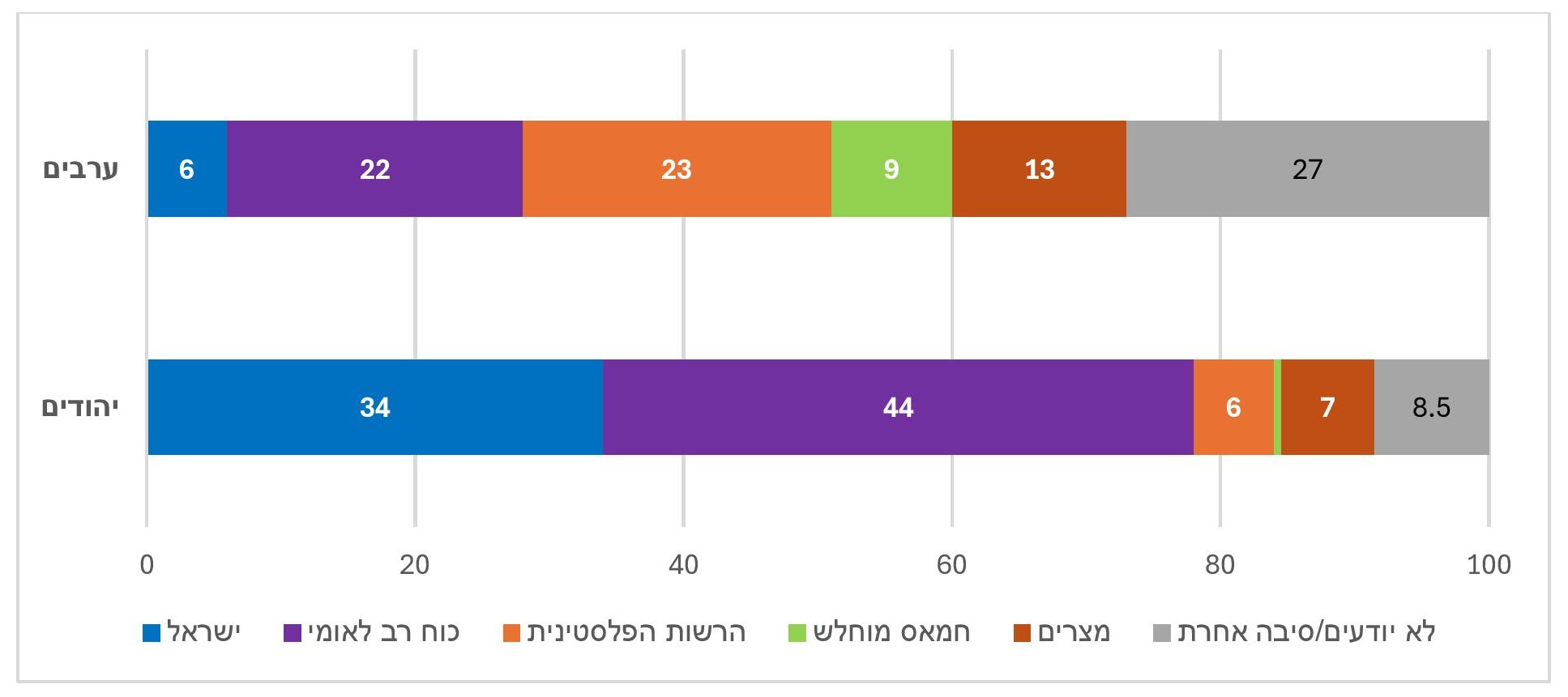 - באשר ל"יום שאחרי" - קרוב למחצית היהודים מעדיפים שכוח רב לאומי ישלוט ברצועת עזה, כשליש תומכים בשליטה ישראלית. בקרב הערבים האפשרויות המועדפות הן הרשות הפלסטינית או כוח רב לאומי.