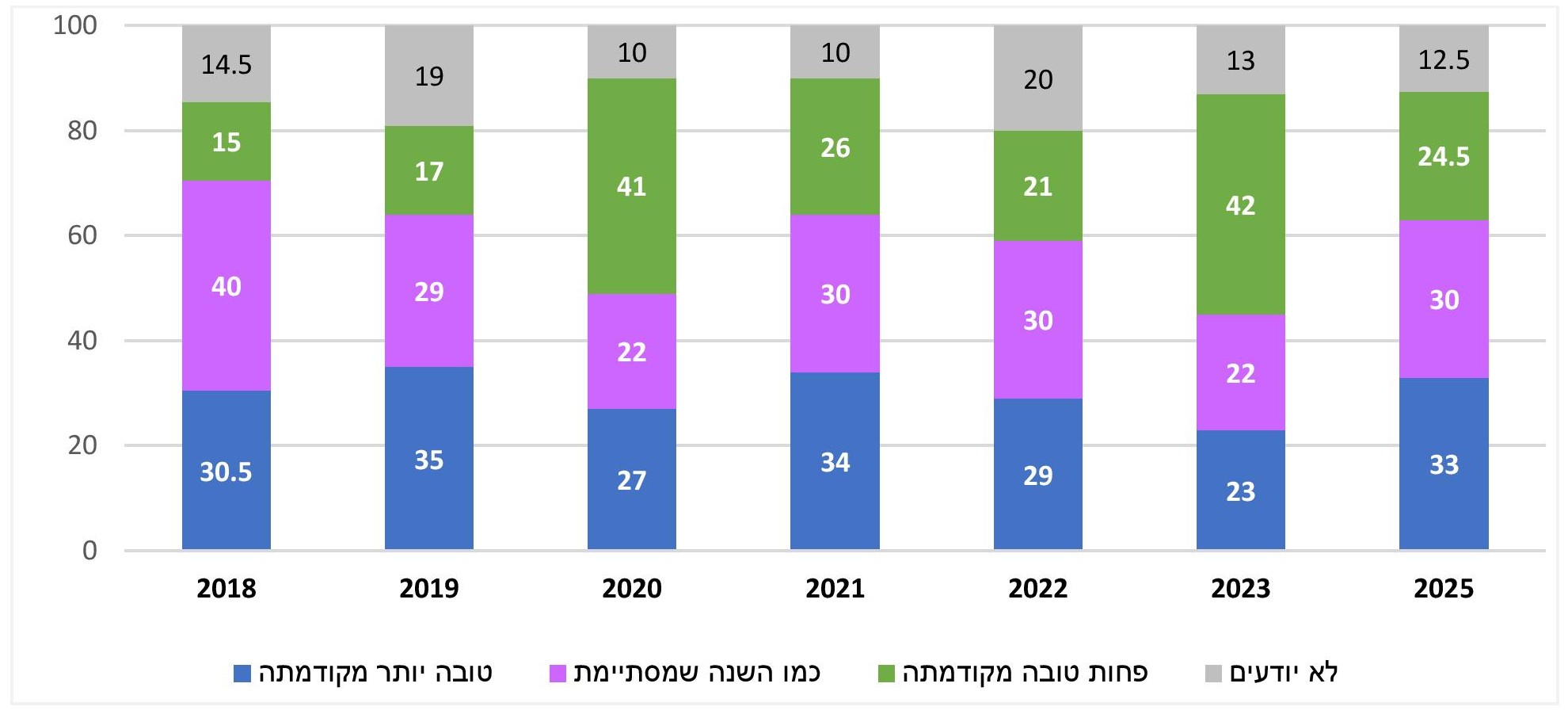 הנתונים מורים על ירידה משמעותית בכלל המדגם בשיעור מי שצופים שהשנה הבאה תהיה גרועה מזו המסתיימת – מ-42% בשנה שעברה (השיעור הגבוה ביותר בכל האפשרויות שהוצגו אז למרואיינים) ל-24.5% בלבד השנה. במקביל, מצאנו עלייה בשיעורי מי שמעריכים כי השנה החדשה תהיה טובה יותר (מ-23% ל-33%) ומי שצופים דמיון בין השנה המסתיימת לשנה הבאה (מ-22% ל-30%).