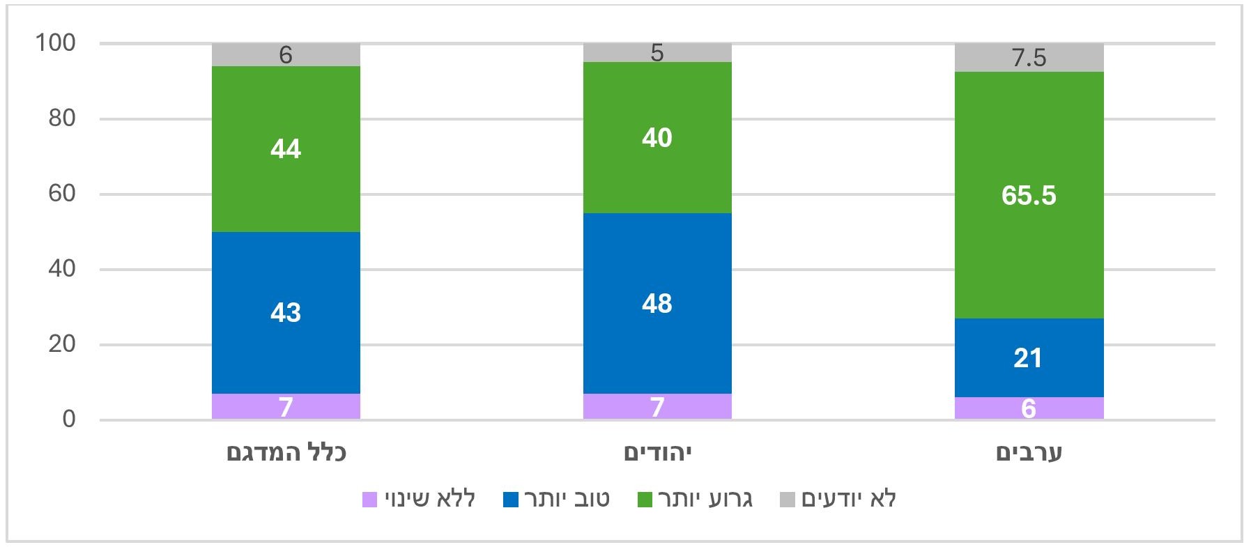 - שיעור היהודים המעריכים את המצב הביטחוני כטוב יותר עולה על שיעור הסבורים שהוא גרוע יותר (48% לעומת 40%). לעומת זאת בקרב הערבים שיעור הסבורים שהמצב גרוע יותר עולה על שיעור המעריכים כי הוא טוב יותר (65.5% לעומת 21%).