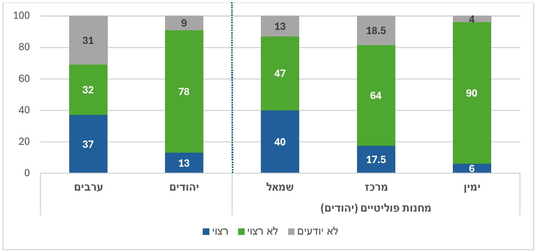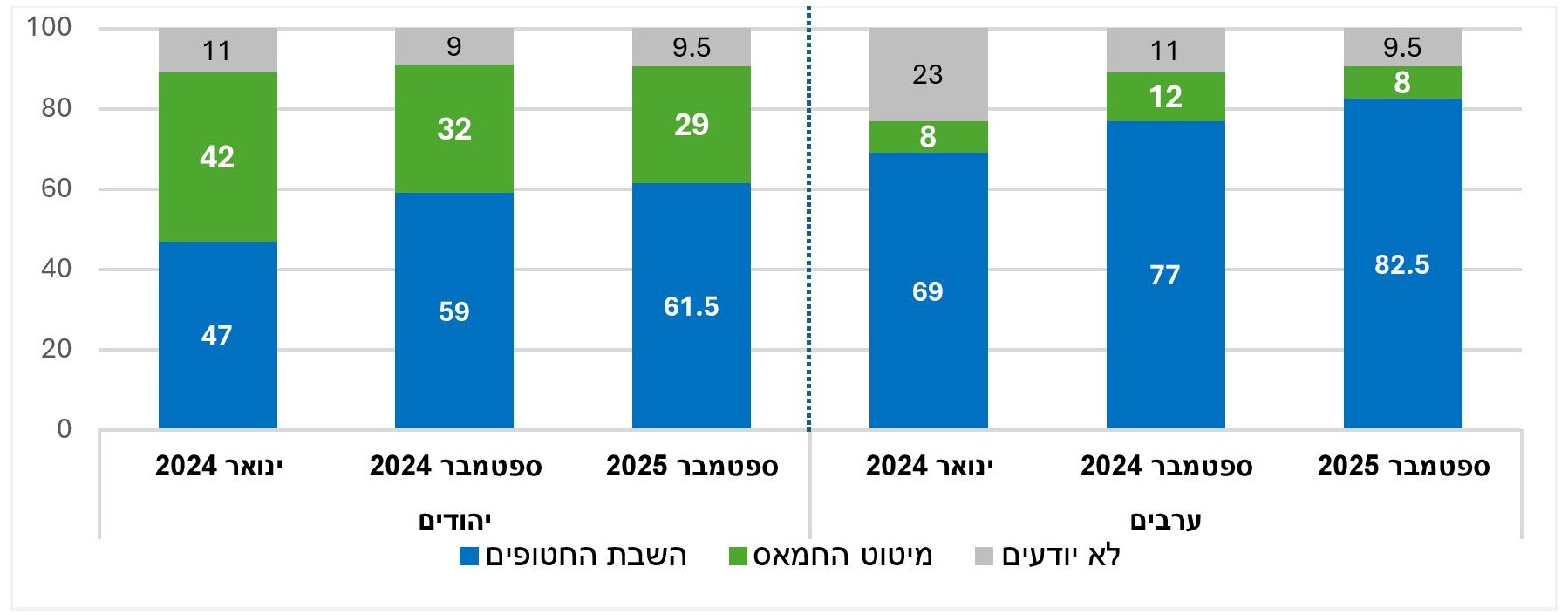 - בשלושת המחנות הפוליטיים (יהודים) סיכון החטופים הוא הנימוק העיקרי של התומכים בהפסקת הלחימה בעזה (שמאל 54%, מרכז 58%, ימין, 45%).