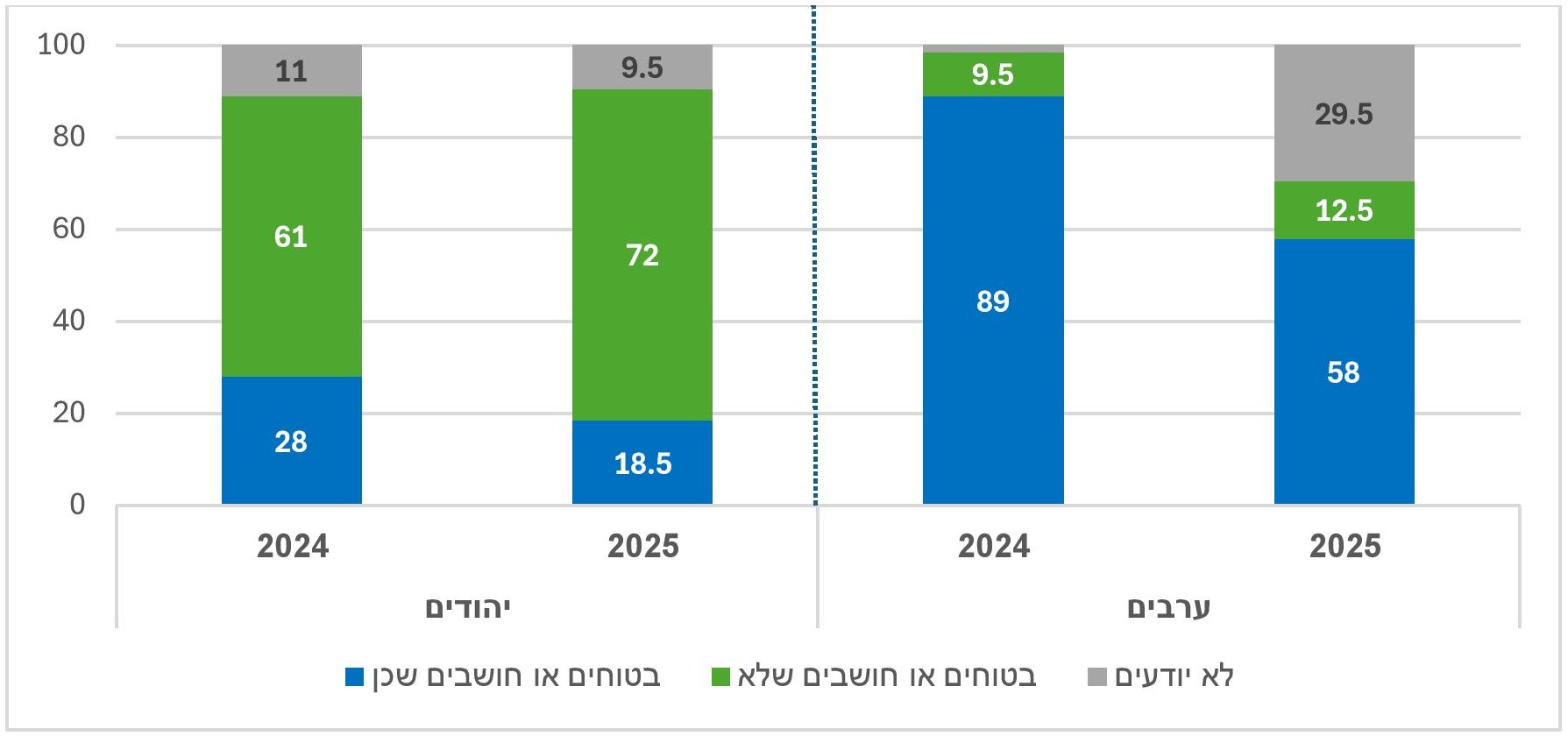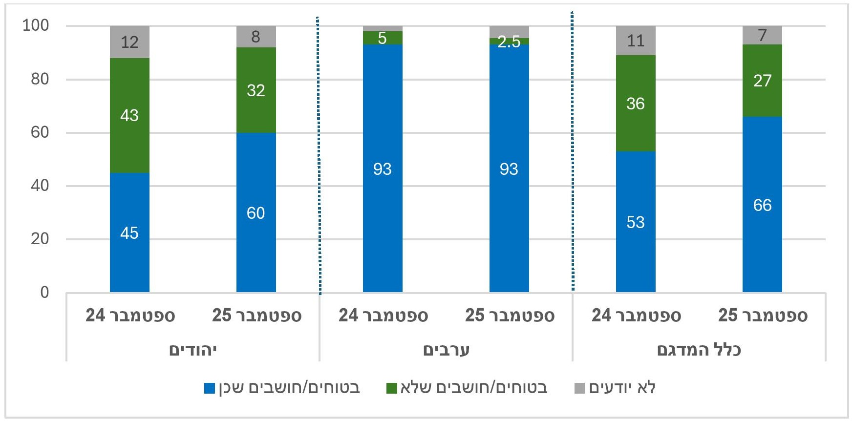 - בשמאל ובמרכז (יהודים) הרוב סבורים שהמצב הביטחוני כיום גרוע יותר (בהתאמה 68% ו-52%) ואילו בימין הרוב סבורים שהוא טוב יותר (57%).