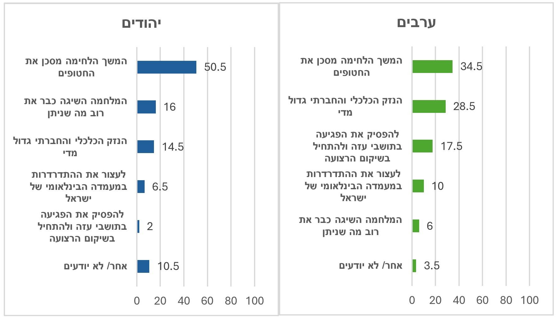 - במפתיע, הנימוק של הפסקת הפגיעה בתושבי עזה והתחלת שיקום הרצועה הגיע בקרב המשיבים הערבים רק למקום השלישי, אחרי החזרת החטופים והנזק הכלכלי והחברתי שהמלחמה גורמת. בקרב היהודים רק 2% ראו בהפסקת הפגיעה בתושבי עזה סיבה להפסיק את המלחמה.