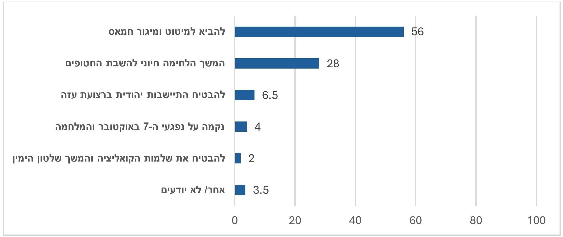 - בעוד בשמאל ובמרכז (יהודים) רוב עצום חושבים שהשבת החטופים צריכה להיות המטרה העיקרית (94%, 80%) בימין מדובר בפחות ממחצית (48%, לעומת 41% הסבורים כי מיטוט החמאס צריכה להיות המטרה העיקרית).