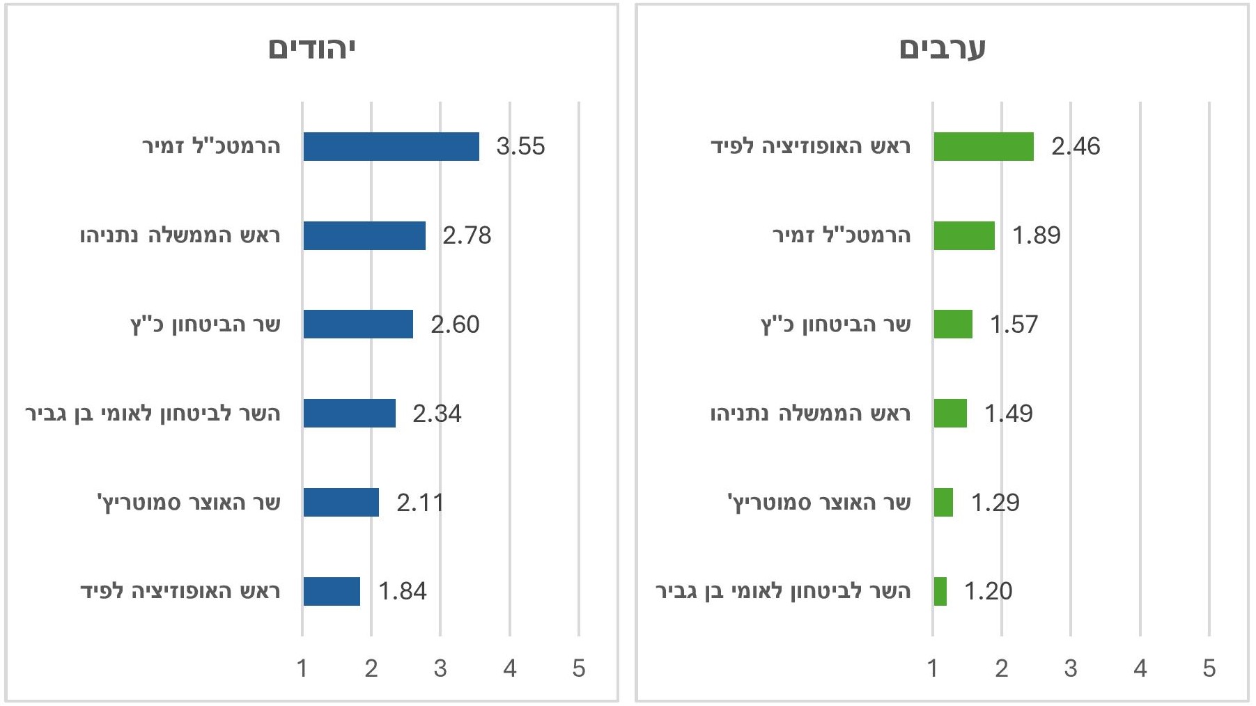 - שר הביטחון כ"ץ, שגם הוא לא נבדק בשנה שעברה, קיבל בקרב היהודים את הציון השלישי בגובהו (2.60), מתחת לרמטכ"ל זמיר ולראש הממשלה נתניהו. גם בקרב הערבים הוא ממוקם שלישי אבל ציונו נמוך בהרבה (1.57).