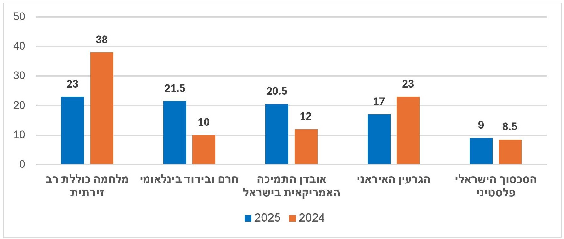 - מלחמה כוללת רב-זירתית נתפסת על ידי 23% מכלל הציבור (יהודים – 22%, ערבים – 29%) כאיום החמור ביותר, אבל חלה כאן ירידה משמעותית בהשוואה לשנה שעברה.