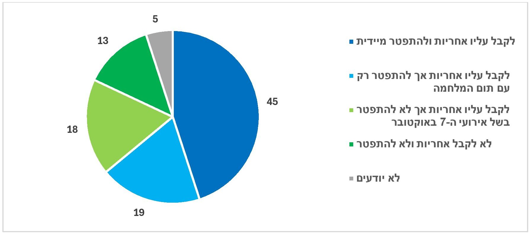 - במרכז, ועוד יותר מכך בשמאל (יהודים), רוב גדול סבורים שעל נתניהו לקחת אחריות ולהתפטר מיידית (63% ו-88% בהתאמה). הימין חצוי בין הסבורים שעליו לעזוב את תפקידו (לקבל אחריות ולהתפטר מיידית - 23%, לקבל אחריות אך להתפטר רק לאחר סיום המלחמה – 25%) לבין הסבורים שאינו צריך להתפטר (לקחת אחריות אך לא להתפטר – 27%, לא לקבל אחריות ולא להתפטר 21.5%).