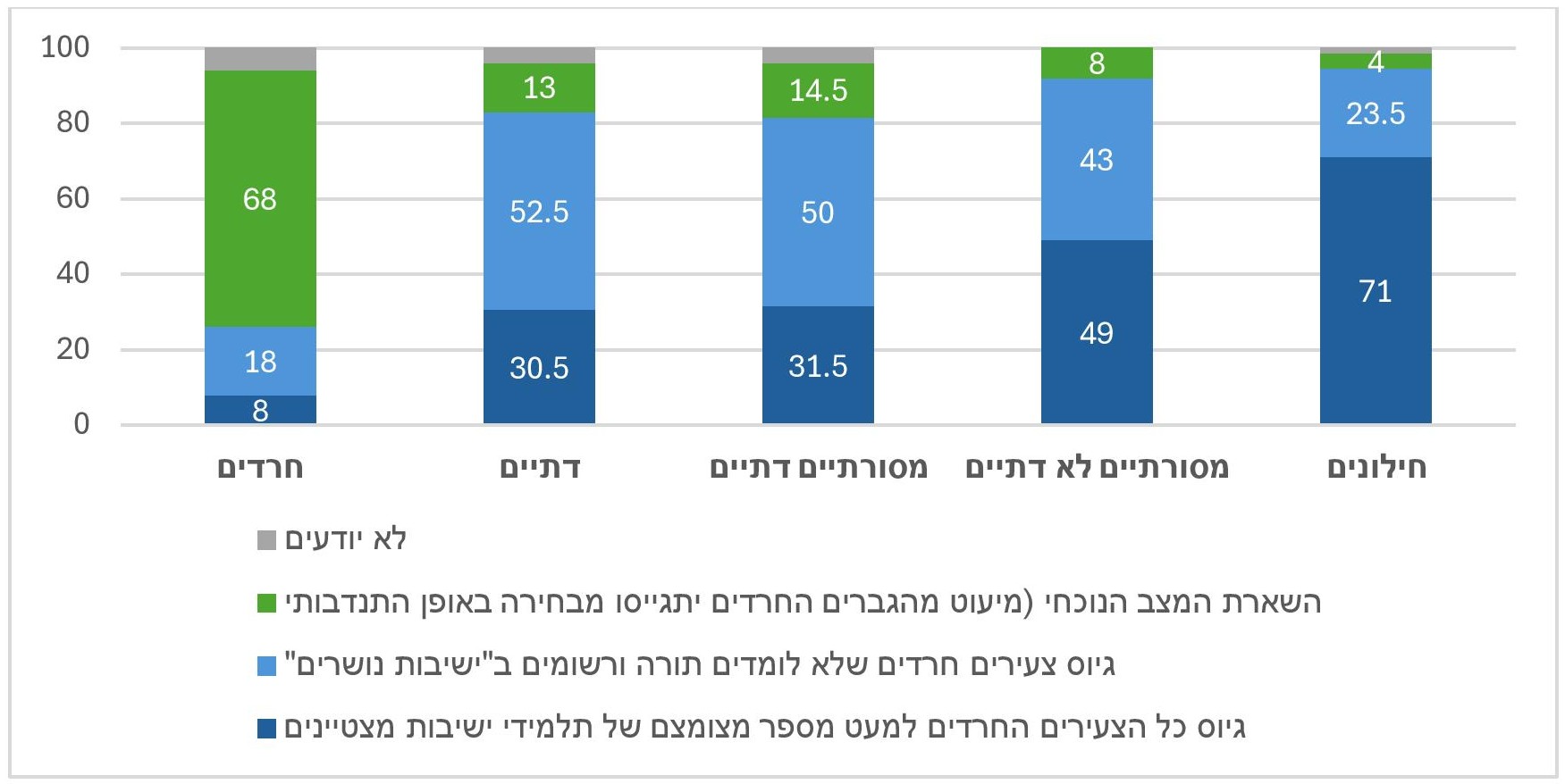 - על אף התמיכה הגבוהה של החרדים במצב הקיים, כרבע מהם תומכים בגיוס חרדים מ"ישיבות נושרים" ו/או בגיוס כל החרדים.