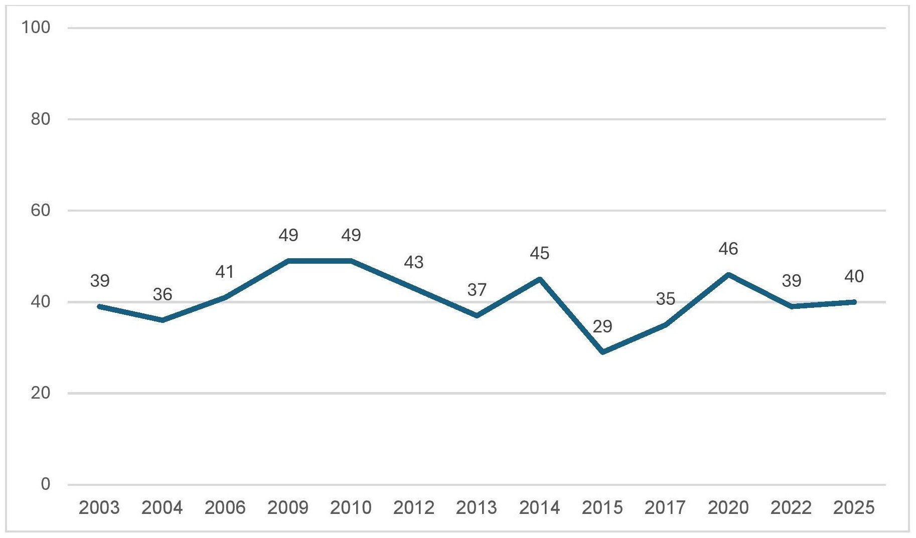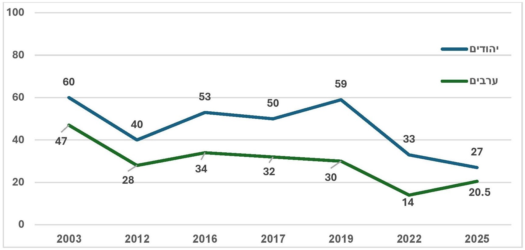מסכימים שיש במדינת ישראל מפלגה שמייצגת בצורה טובה את השקפותיהם, 2025-2003 (%)