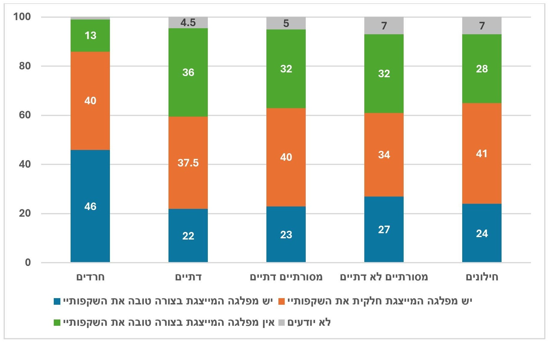 פילוח של מדגם היהודים לפי מיקום עצמי על הרצף חרדים-חילונים מראה כי החרדים מרגישים הכי מיוצגים על ידי מפלגה כזו או אחרת, ואילו בקרב הדתיים נמצא השיעור הגבוה ביותר של מי שאין שום מפלגה המייצגת אותם טוב להרגשתם. למעט החרדים, בכל הקבוצות השיעורים הגבוהים ביותר ענו שיש מפלגה המייצגת את עמדותיהם באופן חלקי.