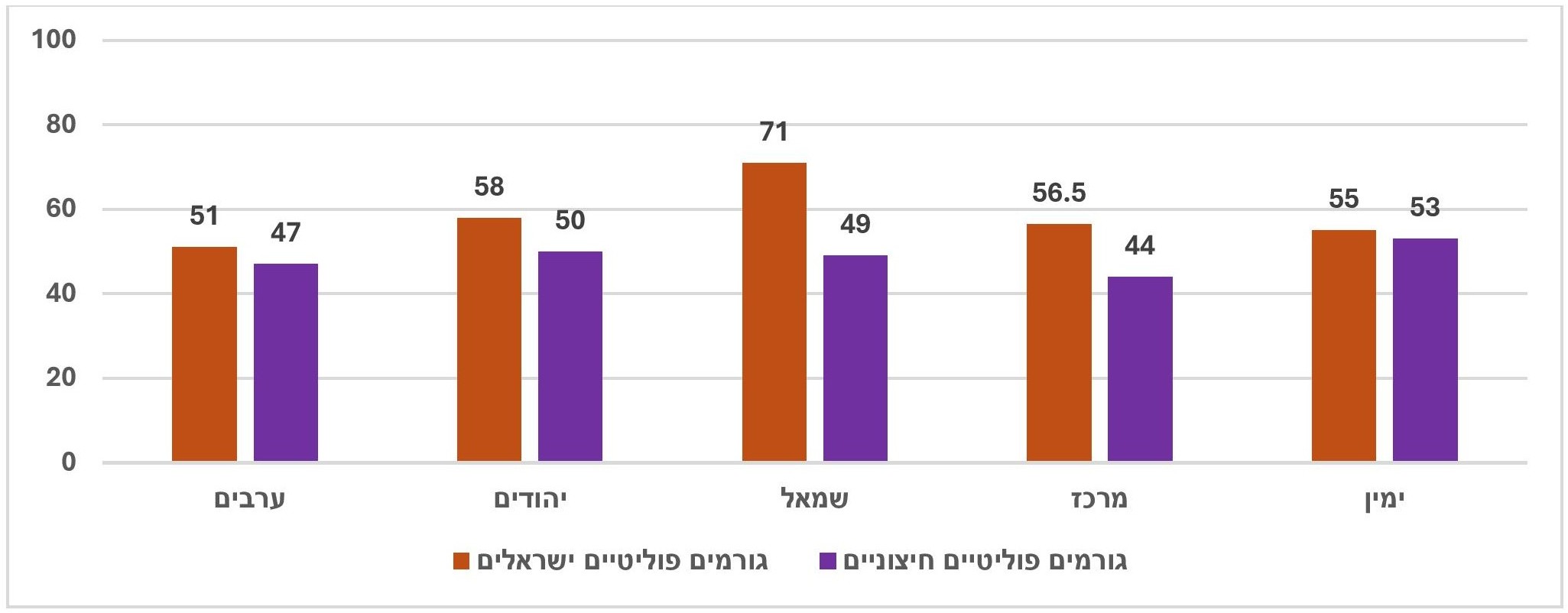 כשמדובר בגורמי פנים שעלולים להתערב בתהליך, בשמאל חשדנים יותר מבימין ובמרכז. לעומת זאת, כשמדובר בגורמי חוץ –בימין שיעור הסבורים שיש לכך סיכויים גבוהים הוא הגבוה ביותר, במרכז – הנמוך ביותר והשמאל בתווך. כמו כן אפשר לראות שהחשש מהתערבות בתוצאות של גורמי פנים גבוה בכל המחנות מהחשש להתערבות של גורמים חיצוניים.