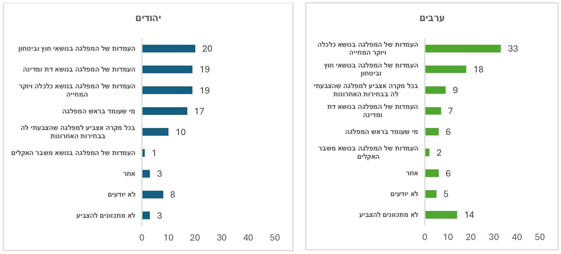 השיעור הגבוה ביותר בקרב מי שזיהו עצמם עם השמאל דיווחו כי עמדות המפלגה בנושאי דת ומדינה הן המכריעות מבחינתם. מי שזיהו עצמם עם המרכז דיווחו שעמדות המפלגה בנושאי כלכלה ויוקר המחיה הן החשובות להם ביותר בבואם להכריע לאיזו מפלגה להצביע, ואילו מי שמיקמו עצמם בימין – עמדות המפלגה בנושאי חוץ וביטחון הן לדעת השיעור הגדול ביותר החשובות בעת ההחלטה באיזו מפלגה לבחור.