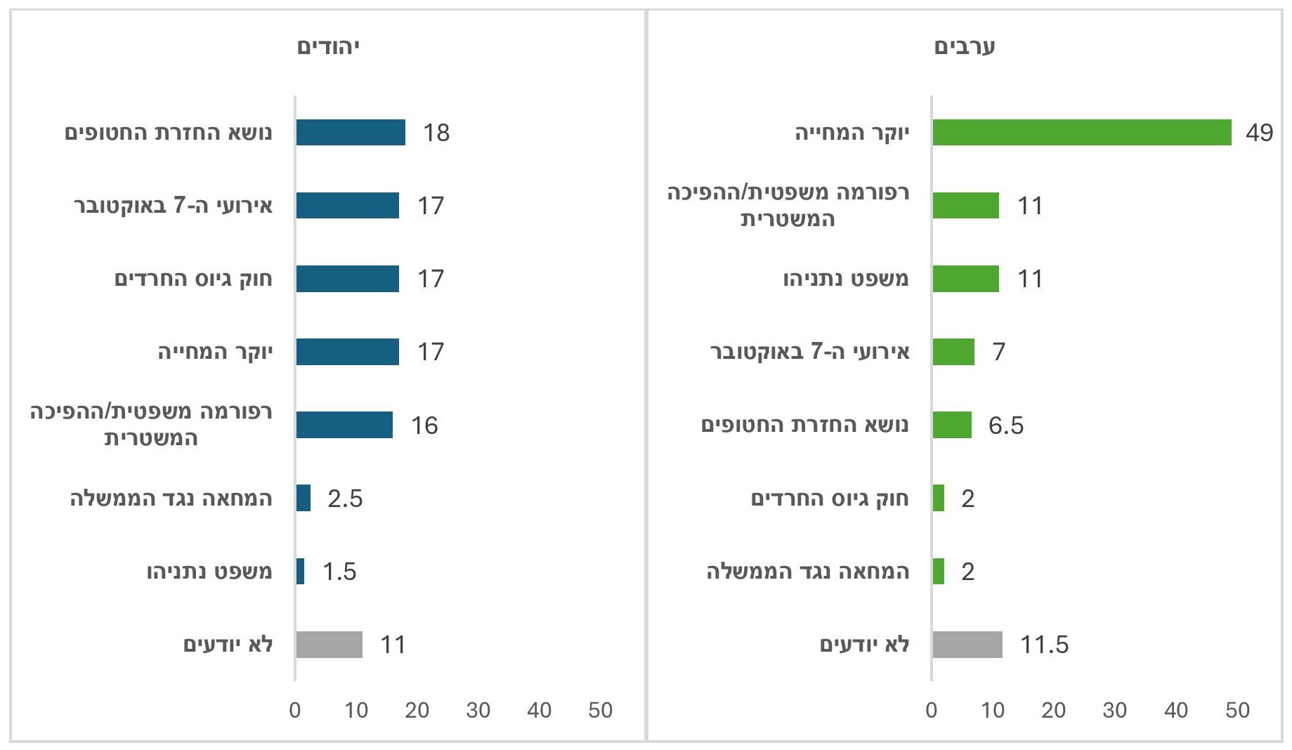 גם בשאלה זו השיעור הגבוה ביותר של מרואיינים ערבים, כמחצית, השיבו כי נושא יוקר המחיה הוא החשוב ביותר עבורם בבואם להחליט למי להצביע. בקרב היהודים מצאנו חמישה נושאים/אירועים עם שיעורים כמעט זהים של המצביעים עליהם כגורמים הדומיננטיים בקביעת המפלגה שיצביעו לה: החזרת החטופים, אירועי 7 באוקטובר, חוק גיוס החרדים, יוקר המחיה והרפורמה המשפטית/ההפיכה המשטרית.