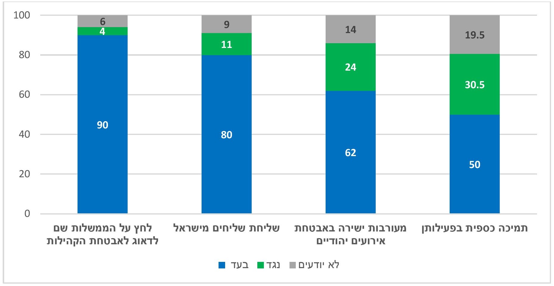 - בקרב היהודים רוב ברור (90%) סבורים שממשלת ישראל צריכה לתמוך בקהילות יהודיות בחו"ל על ידי הפעלת לחץ על הממשלות שם לדאוג לאבטחת הקהילות היהודיות. 80% תומכים בשליחת שליחים מישראל, כ-60% מצדדים במעורבות ישראלית ישירה באבטחת אירועים יהודיים ומחצית בתמיכה כספית בקהילות היהודיות בחו"ל (בנקודה זו שיעור לא יודעים גבוה במיוחד).
