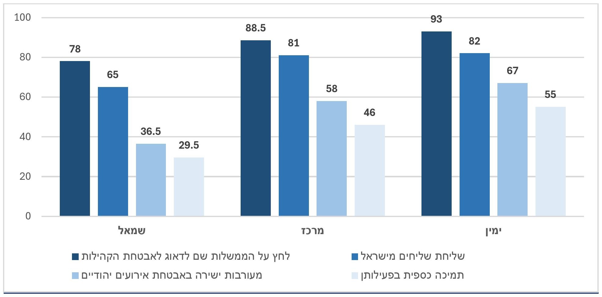 - בקרב הערבים רק מיעוט (ובפער ניכר מהיהודים, למעט בתמיכה כספית בפעילותן שם הפער קטן יותר) סבורים שממשלת ישראל צריכה לתמוך בקהילות יהודיות בחו"ל בכול אחת מהאפשרויות שנבדקו.