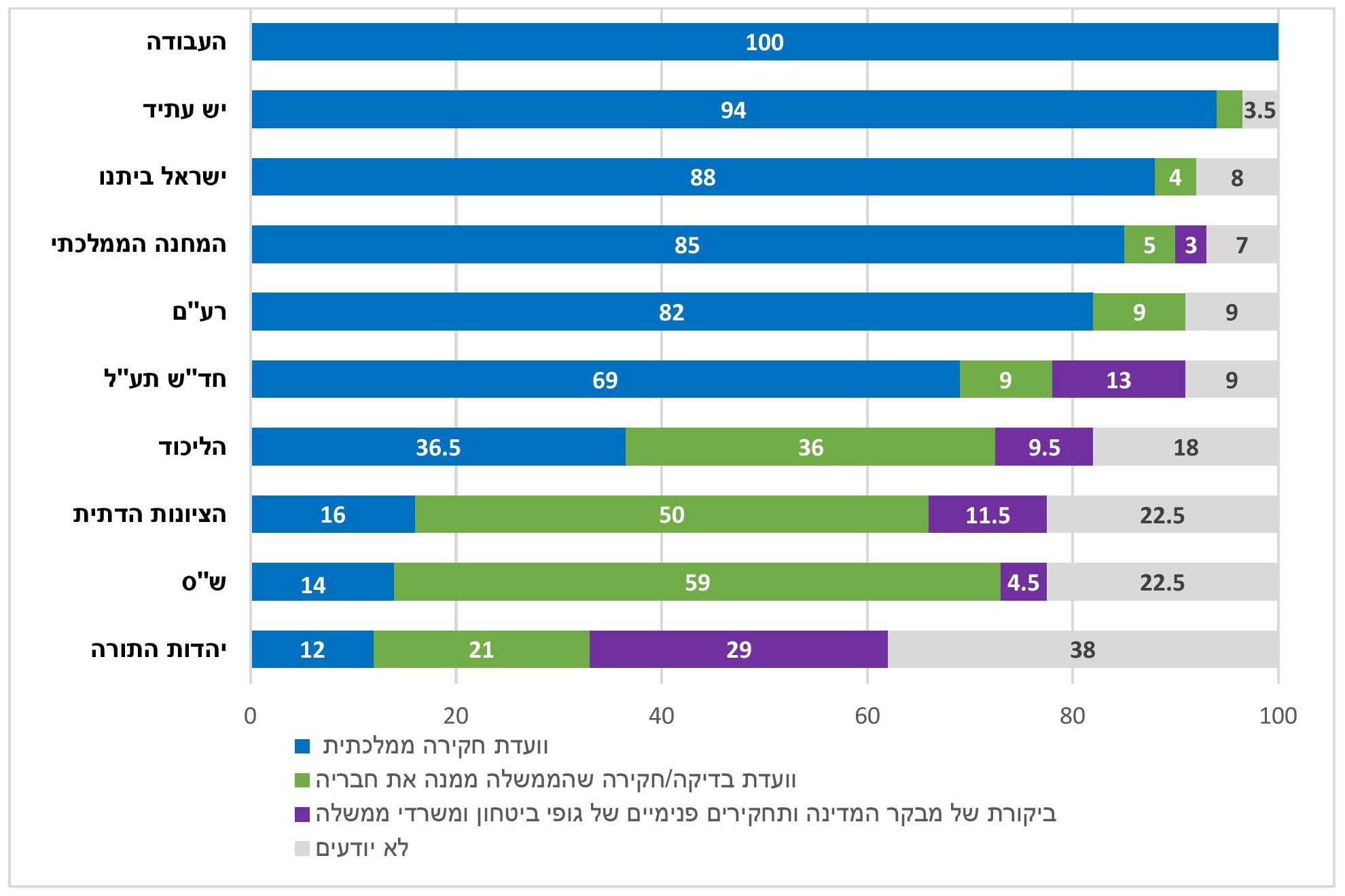 - בקרב מצביעי הליכוד בבחירות 2022 יש פחות או יותר שוויון בין המצדדים בוועדת חקירה ממלכתית ובוועדת בדיקה שממנה הממשלה (36.5% ו-36%). לעומת זאת, בקרב מצביעי הציונות הדתית וש"ס שיעור המצדדים בוועדת בדיקה הממונה על ידי הממשלה גבוה משמעותית מהמצדדים בוועדת חקירה ממלכתית. ביהדות התורה 38% ציינו שאינם יודעים מהו המנגנון המתאים – השיעור הגבוה ביותר. בקרב מצביעי כל מפלגות האופוזיציה רוב גדול תומכים בוועדת חקירה ממלכתית.