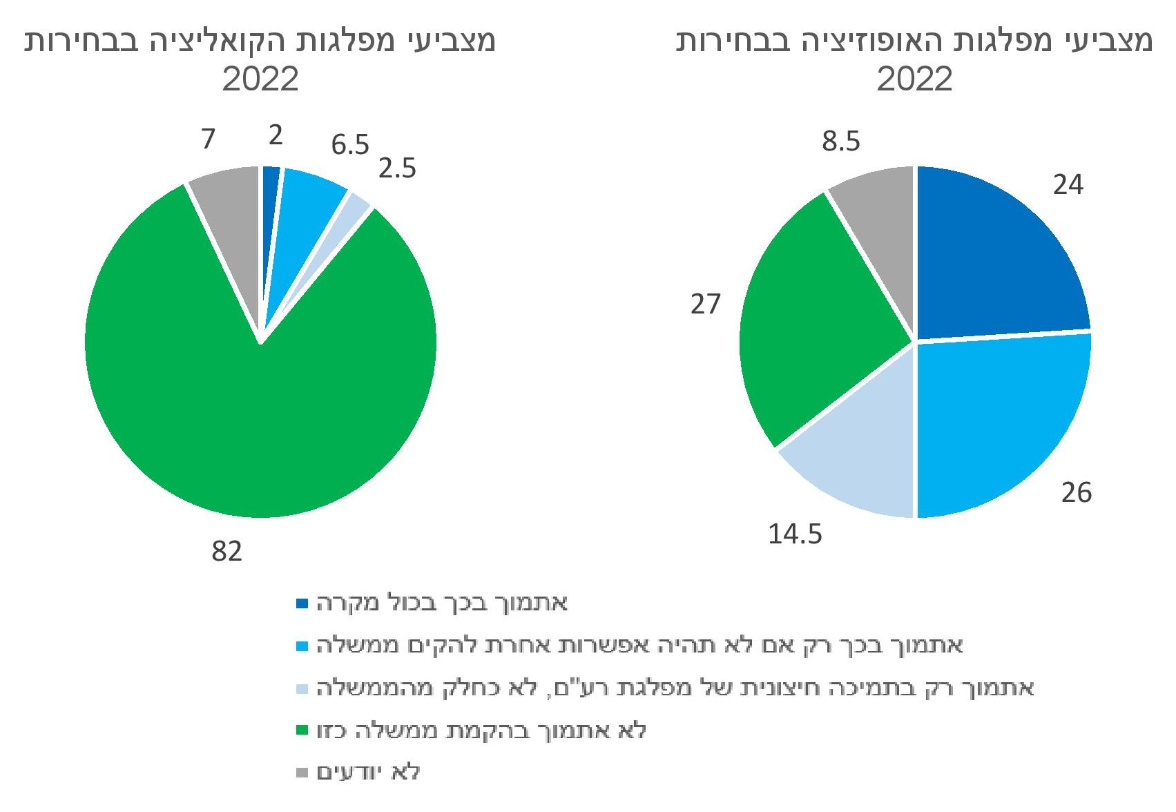 - במצב של אי הכרעה בין הגושים לאחר הבחירות הבאות, כשני שלישים ממצביעי מפלגות האופוזיציה היהודים תומכים בהקמת ממשלה שתסתמך על שיתוף פעולה כלשהו עם מפלגת רע"ם הערבית, אם בהכללתה בממשלה (50%), אם בתמיכתה החיצונית (14.5%). כרבע מציינים שלא יתמכו בכך.