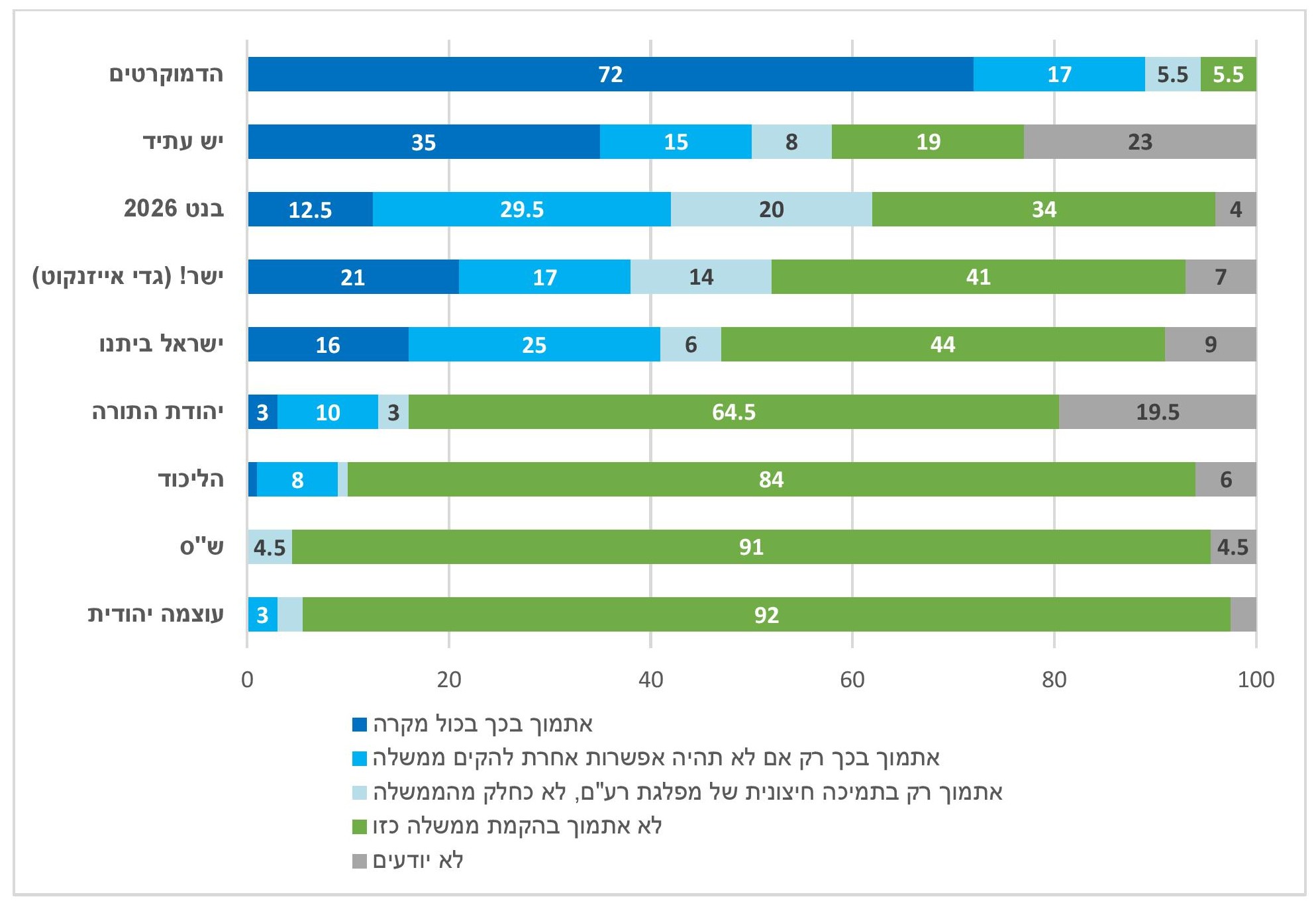 במצב של תיקו בין הגושים לאחר הבחירות הבאות, האם תתמוך או לא תתמוך בהקמת ממשלה בראשות המחנה הפוליטי הקרוב לעמדותיך שתסתמך על שיתוף פעולה עם רע״ם בראשות מנסור עבאס? לפי כוונות הצבעה בבחירות הבאות (%, יהודים)