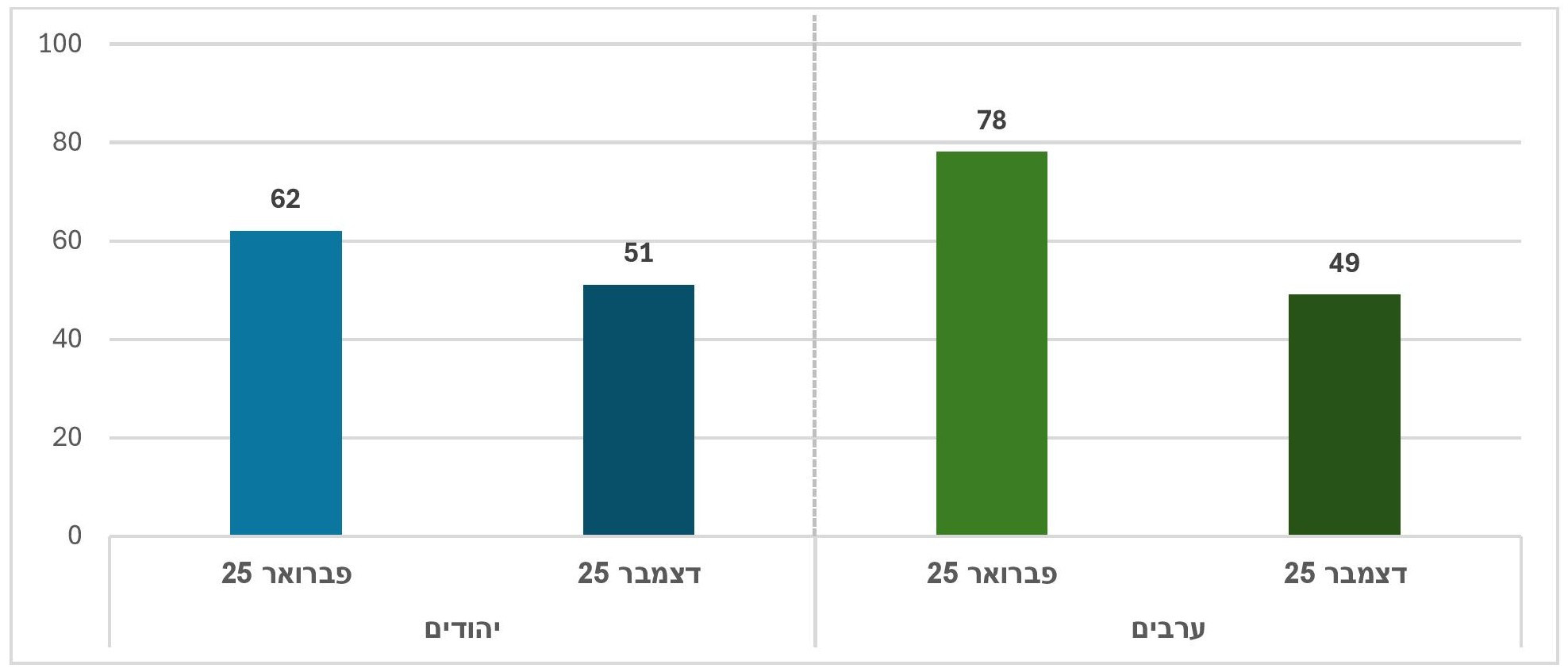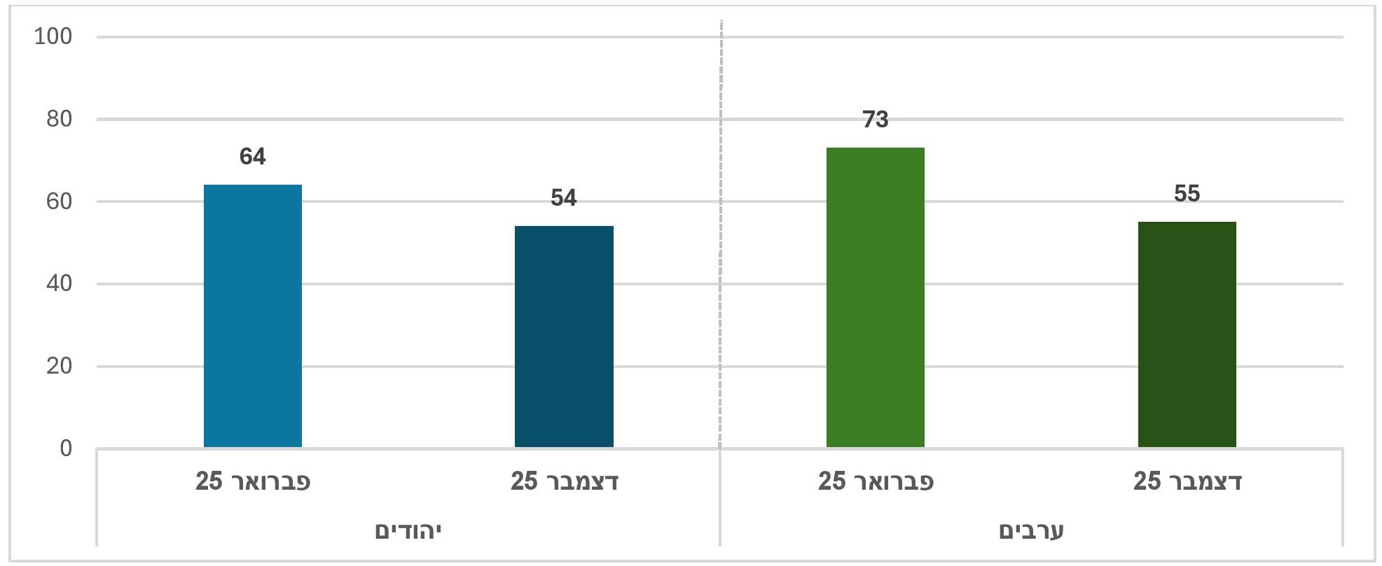 - שיעור המעריכים שכך הדבר בקרב יהודים וערבים הוא כמעט זהה (54%, 55%). זו שוב ירידה וסגירת פער בהשוואה לפברואר 2025 אז 64% מהיהודים ו-73% מהערבים הסכימו עם טענה זו.