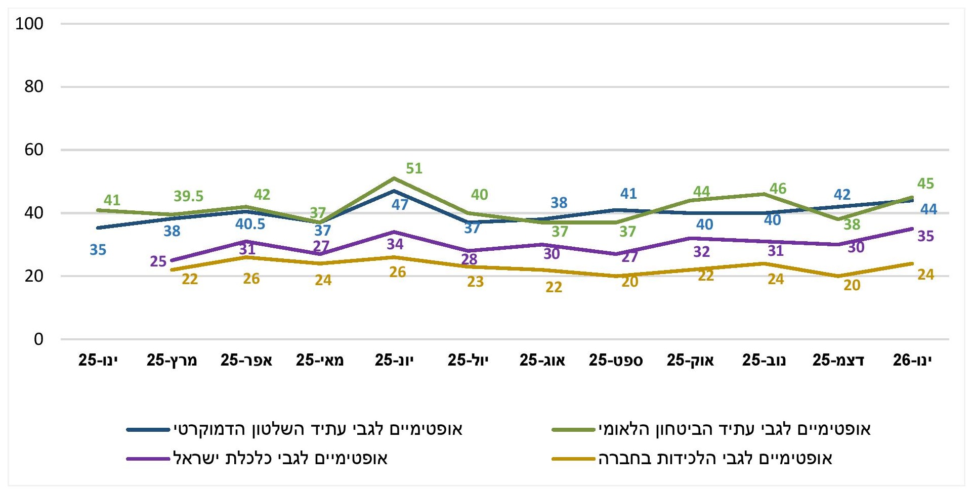 | שמאל-מרכז | 26 | 15 | 25 | 5.5בגלל גודלה של קבוצה זו, הנתון שהתקבל החודש אינו מאפיין אותה. ממוצע שיעור האופטימיים בקרב קבוצה זו ב-6 החודשים האחרונים (יולי-דצמבר 2025) עמד על: 11% |