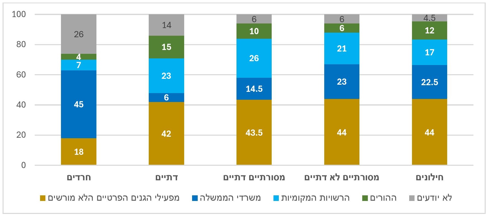 - בעוד שלמעלה מ-40% מהחילונים, הדתיים והמסורתיים (יהודים) הטילו את עיקר האחריות על מפעילי הגנים, ולאחריהם על משרדי הממשלה או על הרשויות המקומיות, הרי שבקרב החרדים התמונה שונה לגמרי: השיעור הגבוה ביותר (45%) גורסים שמשרדי הממשלה נושאים בעיקר האחריות. רק מיעוט מהחרדים (18%) תולים את האחריות על מפעילי הגנים. עוד בולטים שיעורם הגבוה של ה"לא יודעים" בקרב החרדים ושיעורם הנמוך של התולים את האחריות בהורים.