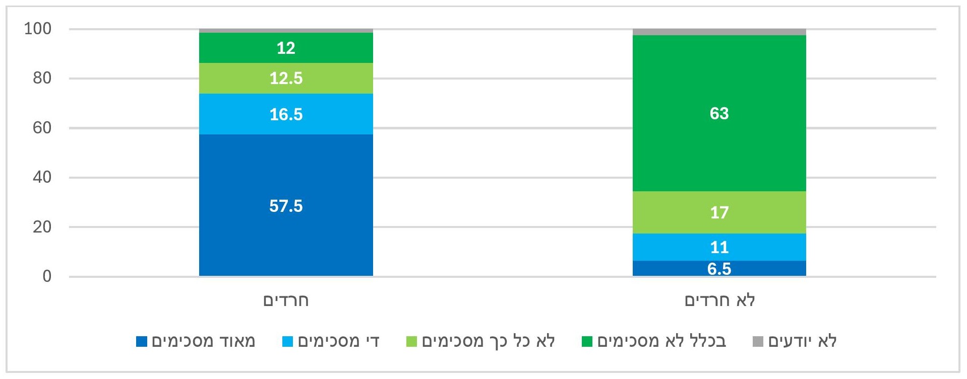 - עוד בהקשר זה בחנו את מידת ההסכמה בציבור עם הטענה של כמה חברי כנסת וגורמים חרדים לפיה היועצת המשפטית לממשלה היא האשמה במות הפעוטות וזאת בשל החלטתה להקפיא את סבסוד מעונות היום למשפחות אברכים שנאלצו להפקיד את הפעוטות במסגרות פרטיות לא מורשות שהן זולות יותר. רוב גדול (70%) בכלל הציבור אינם מסכימים עם האשמה הזו.