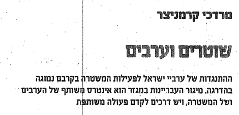 הסוגיה של יחסי משטרה - חברה ערבית היא מורכבת ורגישה. יחסי משטרה - מיעוט הם, בדרך כלל, טעונים. כאן מדובר באוכלוסייה שהיא, בעת ובעונה אחת, מיעוט לאומי- תרבותי, מיעוט פוליטי ומיעוט פריפריאלי הסובל מעוני. אם אין משקיעים מאמצים מיוחדים במערכת יחסים זו עלולות להיווצר הן במשטרה והן בקרב המיעוט עמדות שליליות הדדיות, שעלולות להביא לאירועים של אלימות קשה, כפי שהתרחשו באוקטובר 2000.