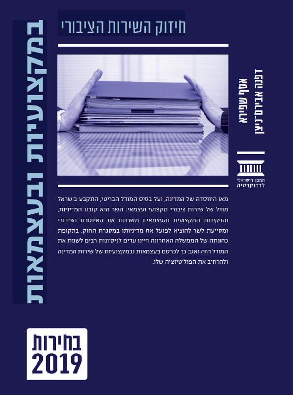 מאז היווסדהּ של המדינה, ועל בסיס המודל הבריטי, התקבע בישראל מודל של שירות ציבורי מקצועי ועצמאי: השר הוא קובע המדיניות, והפקידות המקצועית והעצמאית משרתת את האינטרס הציבורי ומסייעת לשר להוציא לפועל את מדיניותו במסגרת החוק. בתקופת כהונתה של הממשלה האחרונה היינו עדים לניסיונות רבים לשנות את המודל הזה ואגב כך לכרסם בעצמאות ובמקצועיות של שירות המדינה ולהרחיב את הפוליטיזציה שלו.