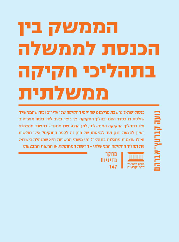 כנסת ישראל נחשבת פרלמנט שהיקפי החקיקה שלו אדירים וכזה שהממשלה שולטת בו בסדר היום ובהליך החקיקה. אך כיצד באים לידי ביטוי מאפיינים אלו בתהליך החקיקה הממשלתי, למן הרגע שבו מתגבש במשרד ממשלתי רעיון להצעת חוק ועד לכניסתו של חוק זה לספר החוקים? אילו חולשות ואילו עוצמות מתגלות בתהליך? ומי משתי הרשויות היא שמנהלת בישראל את תהליך החקיקה הממשלתי – הרשות המחוקקת או הרשות המבצעת?